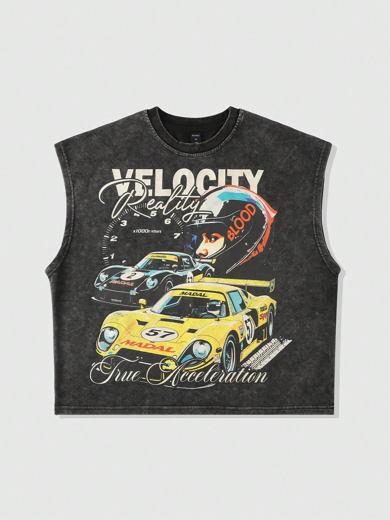 Street Life ملابس علوية بدون أكمام بتصميم بطباعة حرف وسيارة بشكل فضفاض واسع للرجال مغسول قطعة واحدة