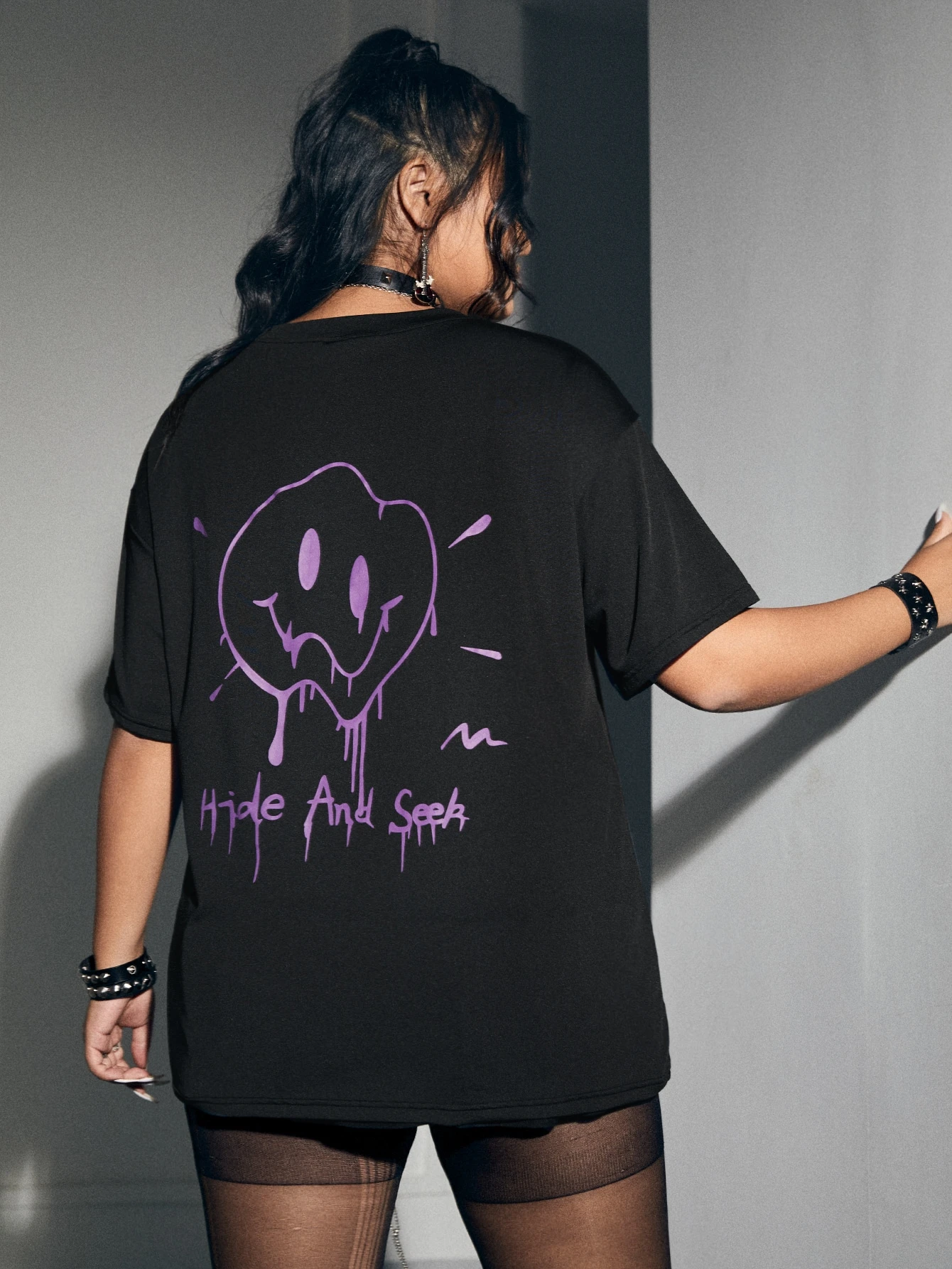 Street Life تي شيرت منخفض الاكتاف بجرافيك عبارة ورسوم كارتون مقاس كبير