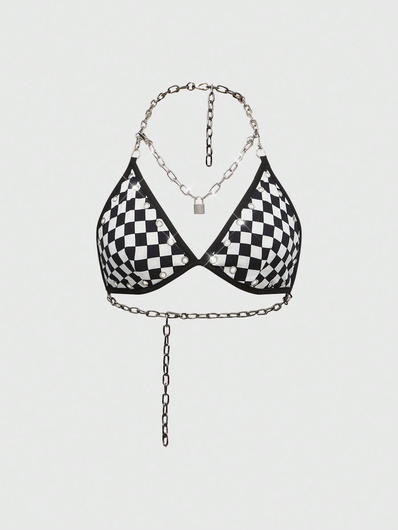 Street Life بيكيني كامي سولي مثير بتصميم مربعات أسود وأبيض مع سلسلة معدنية وفتحات مثلثة مكشوفة