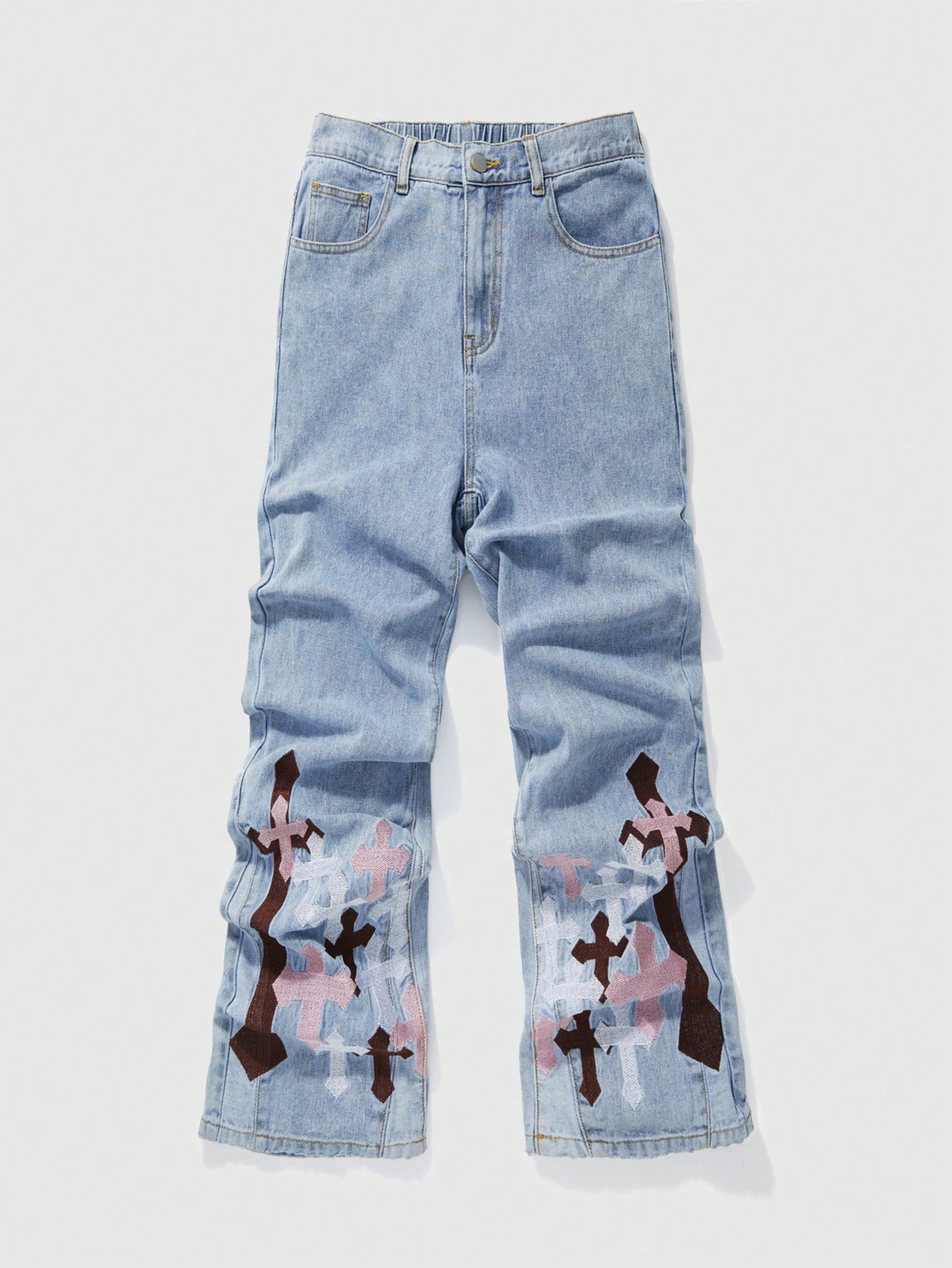 Street Life بنطلون جينز مستقيم الساق بتطريز صليبي، أنيق وعصري لأسلوب الشارع، مناسب للتنقل اليومي