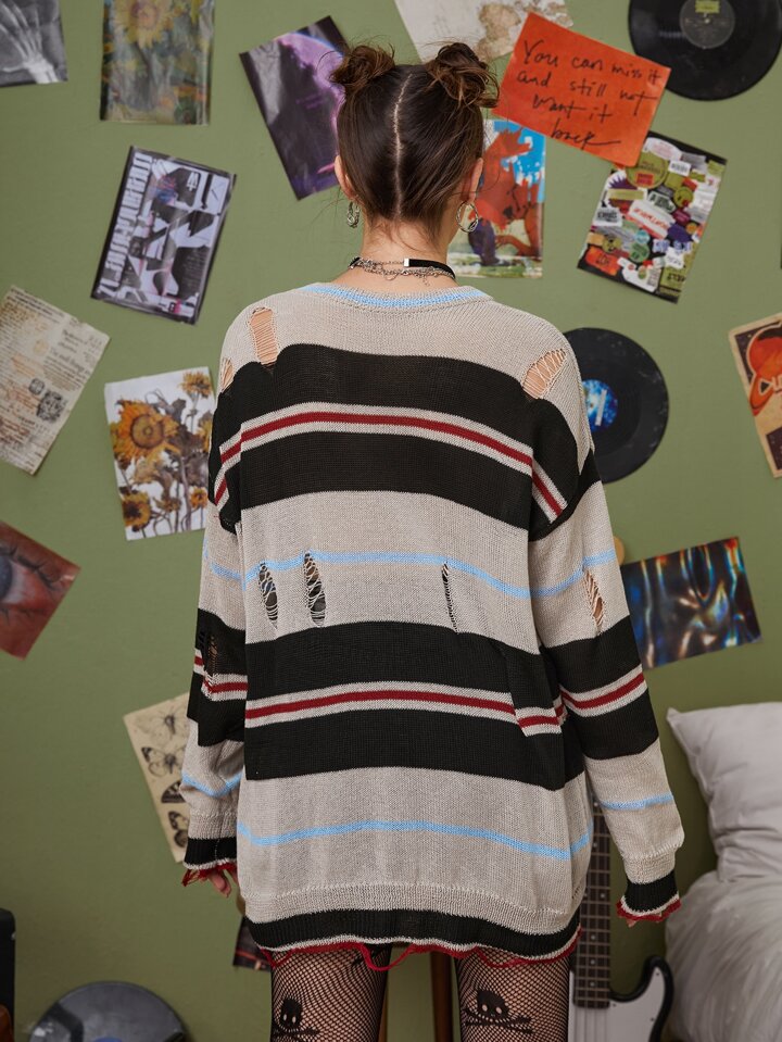 كنزة صوف مخطط مهشم منخفض الاكتاف