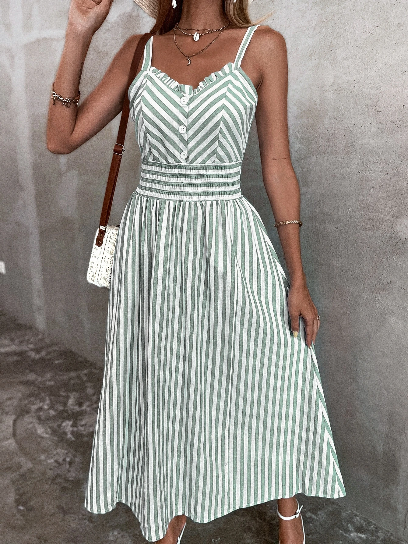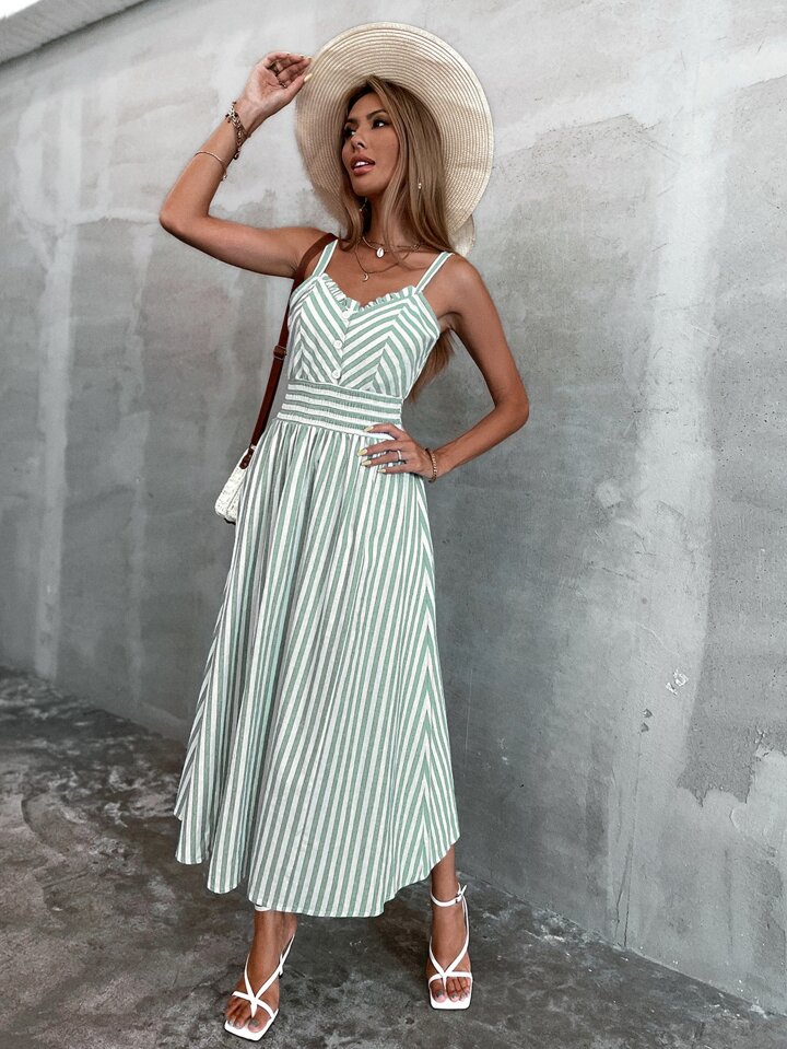 فستان كامي بخصر مدرز وبطباعة مخطط