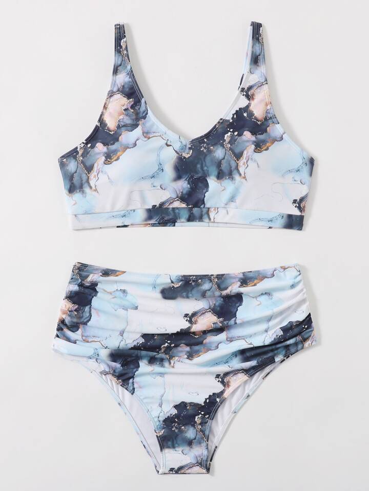 مقاس كبير رخام طقم بيكيني لباس علوي تانك & تجاعيد خصر عالي لباس قيعان 2قطع بدلة سباحة