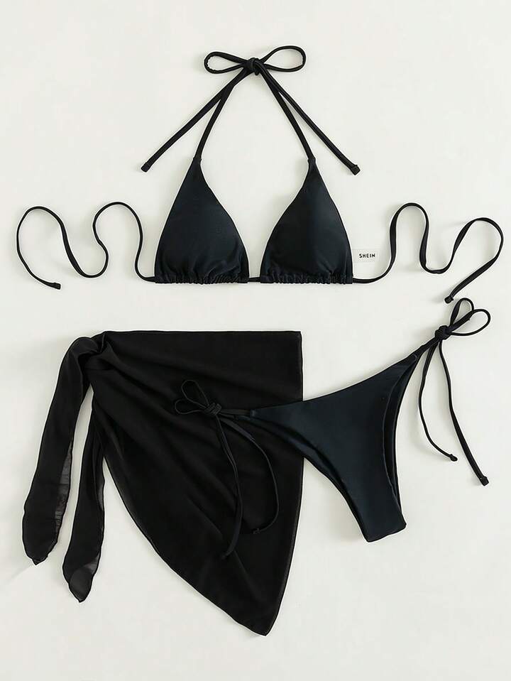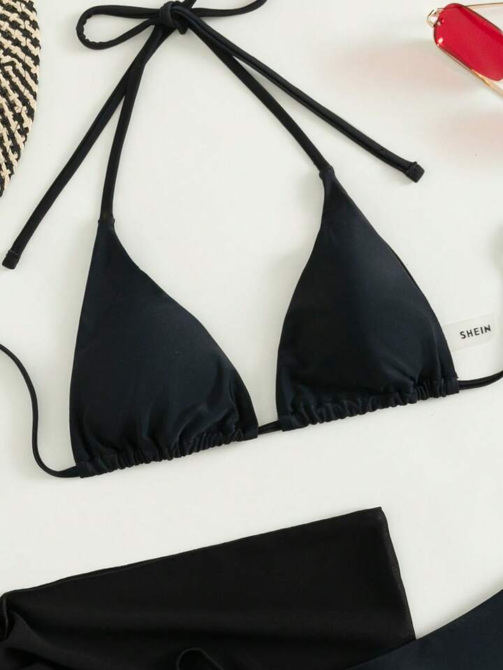 موحدة اللون طقم بيكيني مثلث حمالة صدر & سروال داخلي ثونغ لباس قيعان وتنورة الشاطئ 3قطعات بدلة سباحة