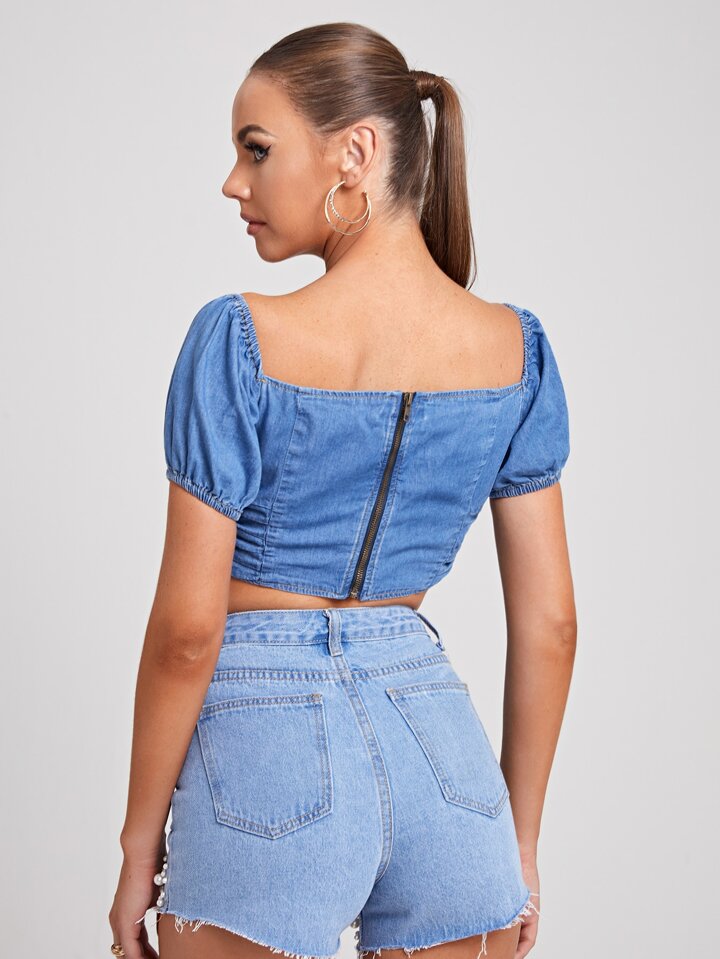 لباس علوي جينز كروب بأكمام منفوخ وبعنق سويت هارت