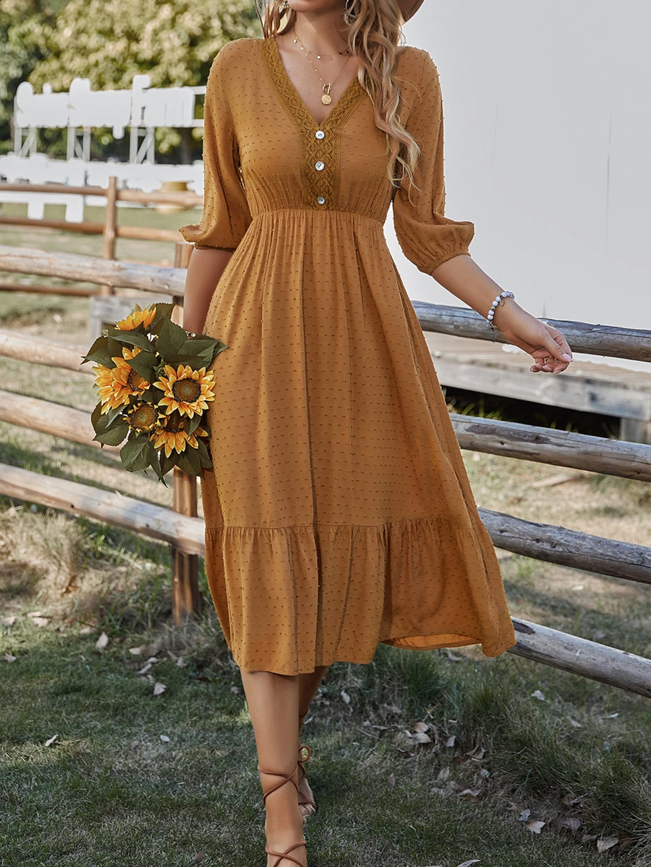 فستان منقط سويسري بتفاصيل دانتيل زرار وهمي أكمام فانوس حافة مكشكشة