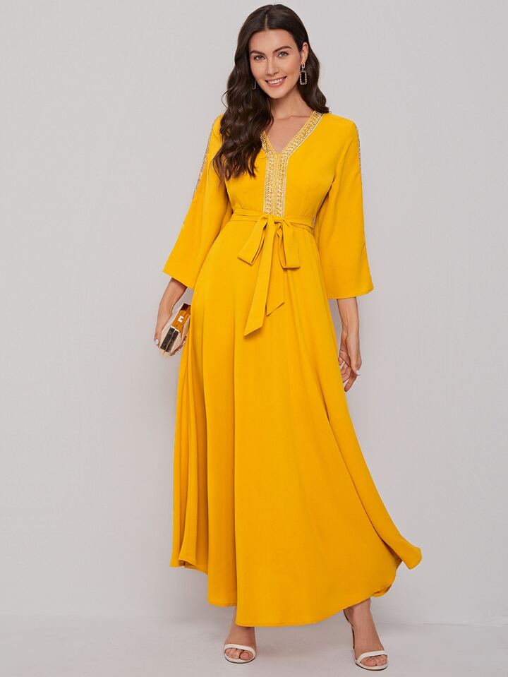 فستان محتشم مزين بحزام وتفاصيل شريطية