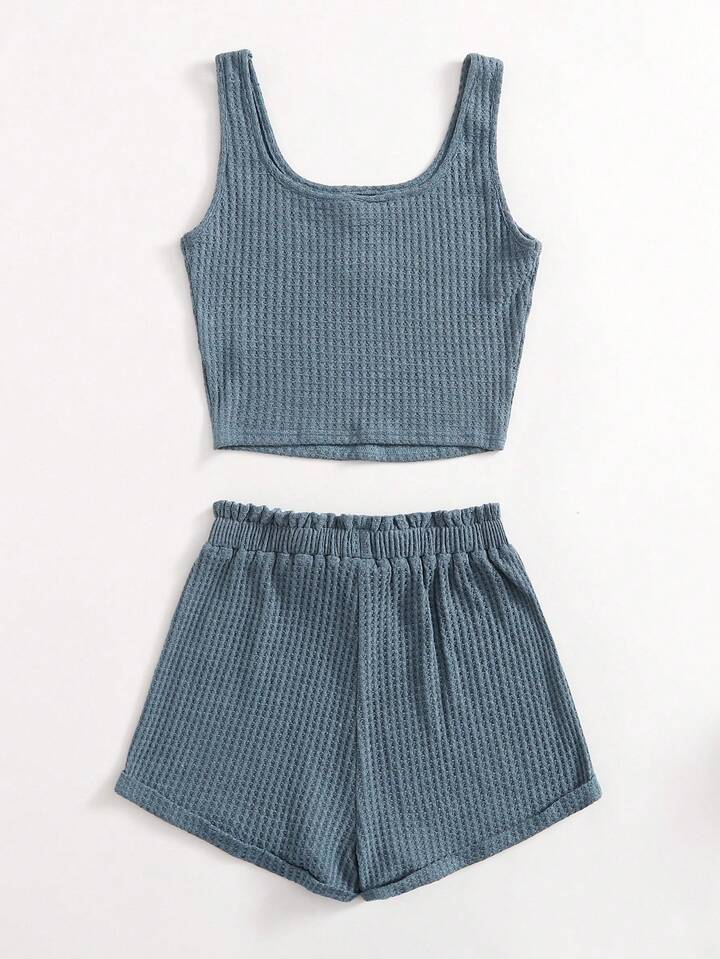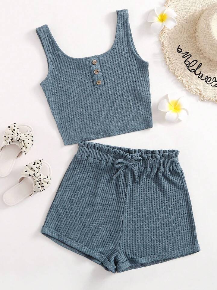 طقم شورت مع لباس علوي تانك بازرار امامي للبنات المراهقات