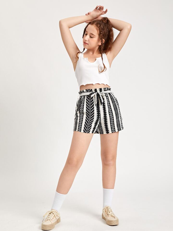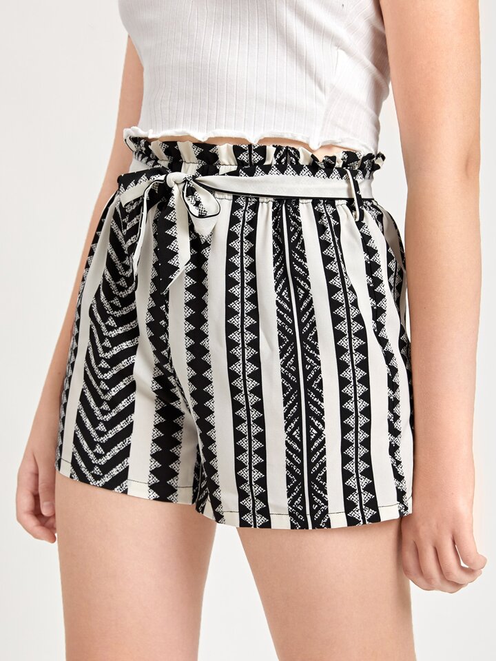 شورت بحزام بخصر جيب ورقي بطباعة هندسي للبنات المراهقات