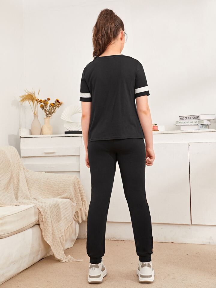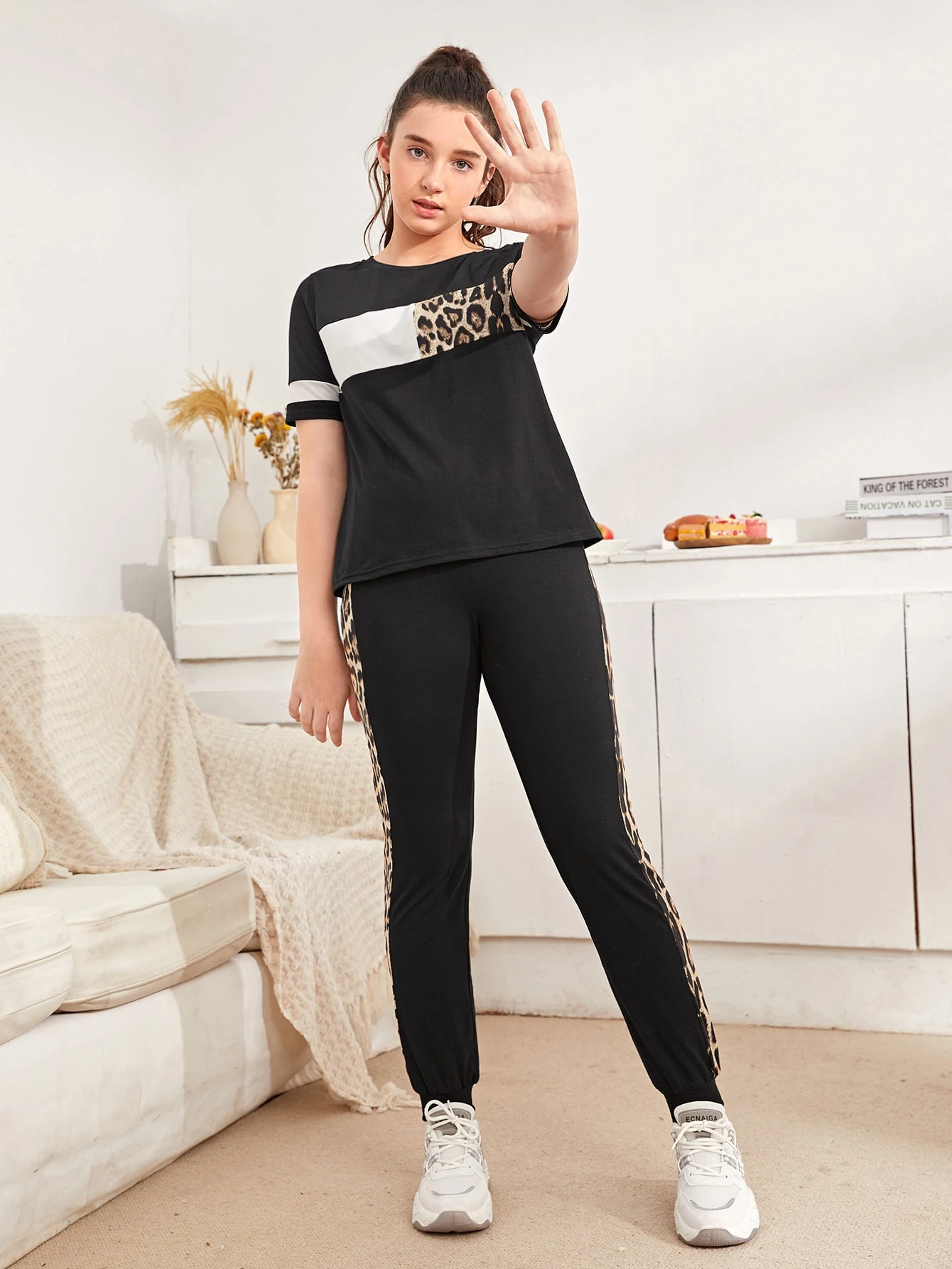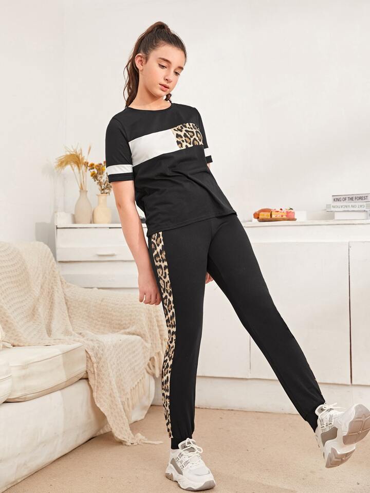 طقم توب بألوان متباينة وطباعة جلد الفهد وبنطلون فتاة