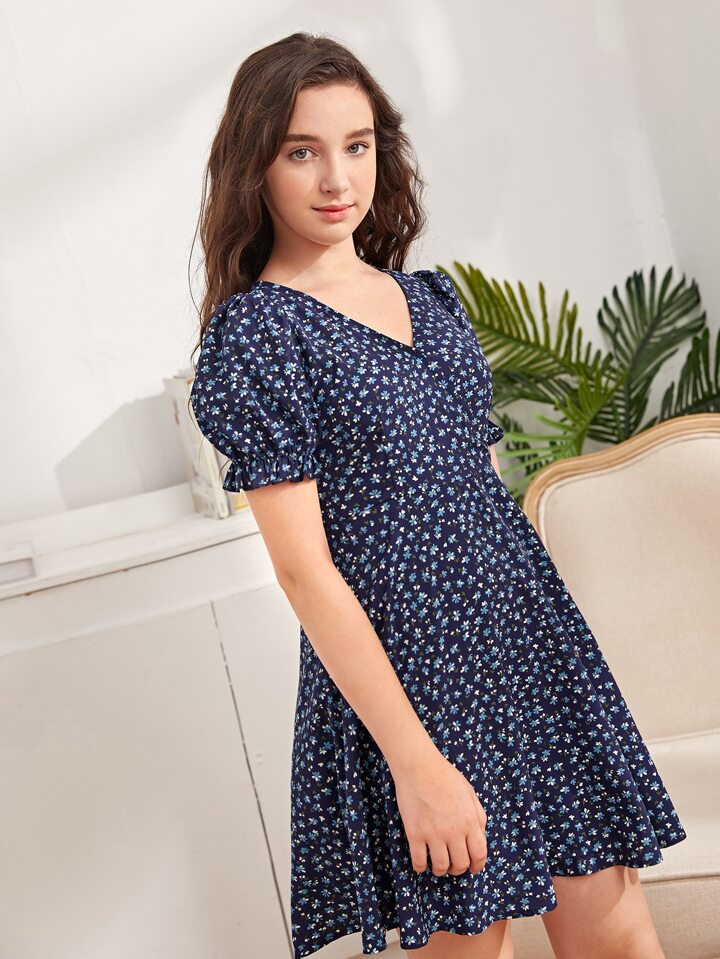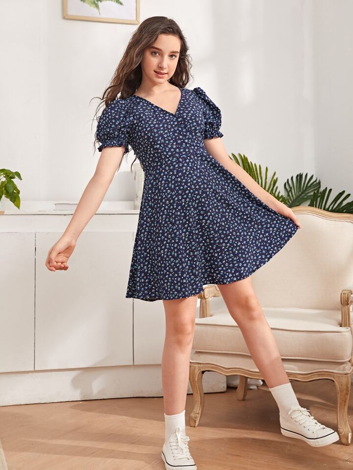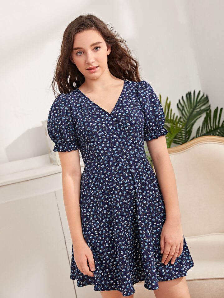 فستان بزهر اقحوان باكمام منفوخ للبنات المراهقات