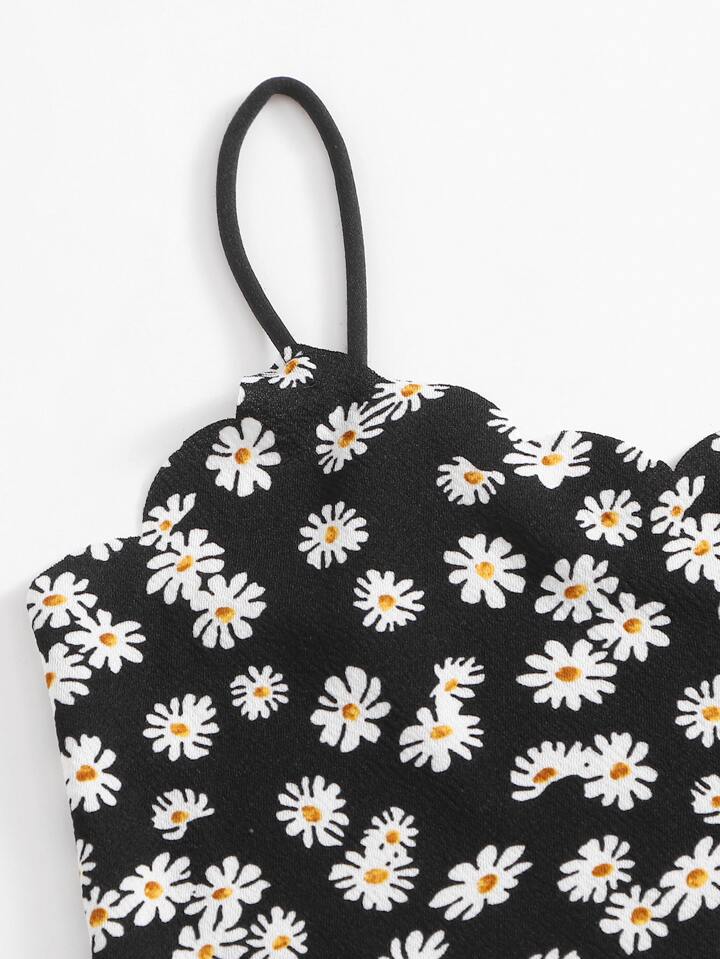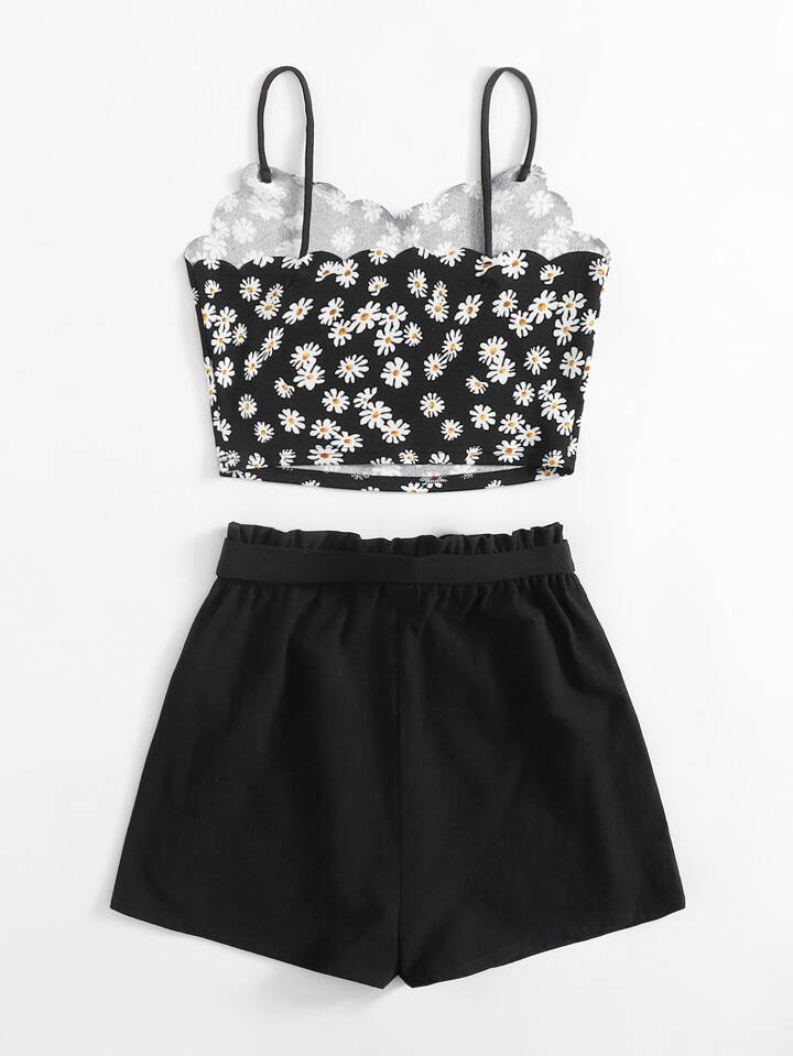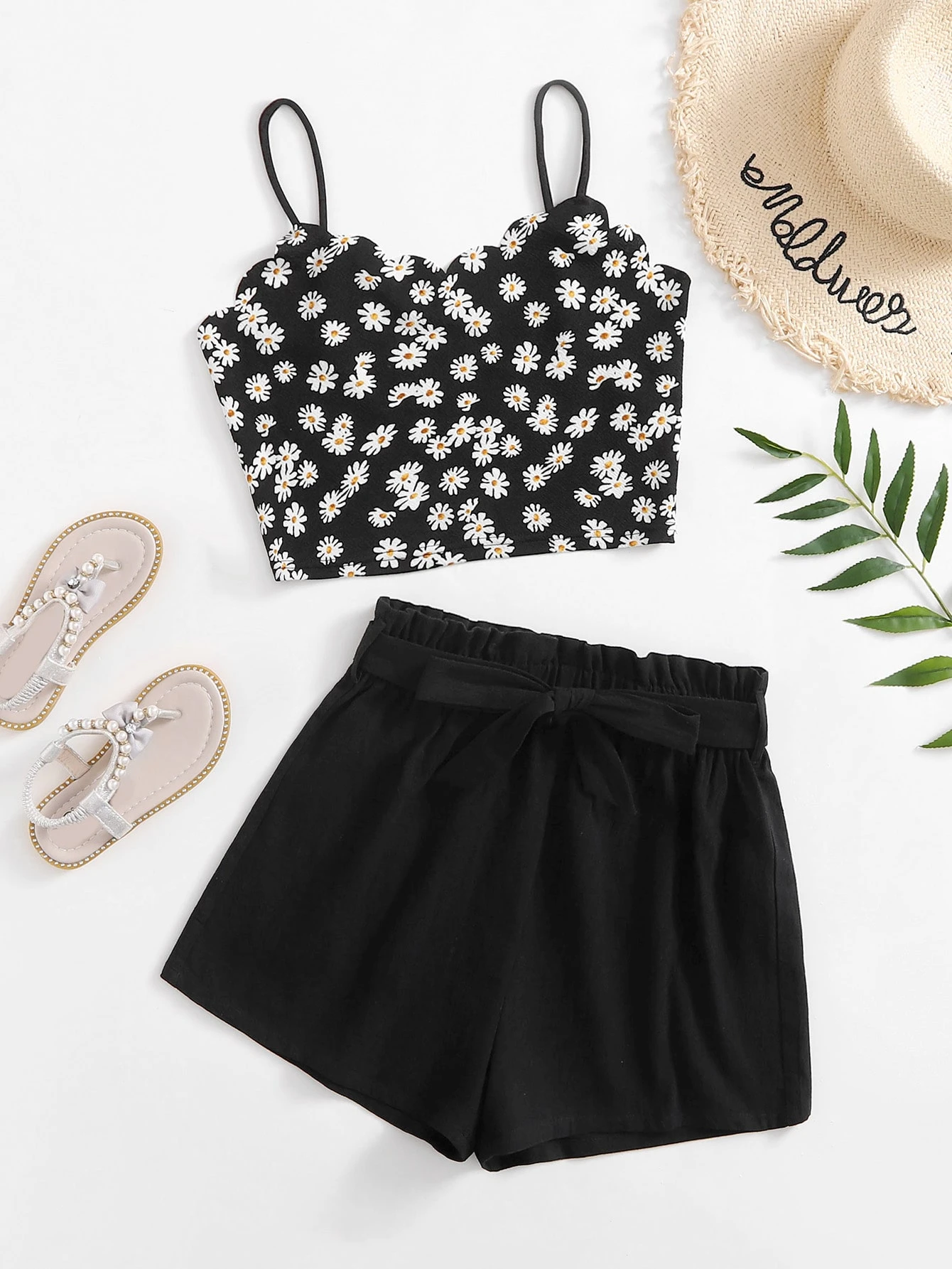 طقم شورت بخصر جيب ورقي مع لباس علوي كامي مزهر مقلم صدفي للفتيات المراهقات