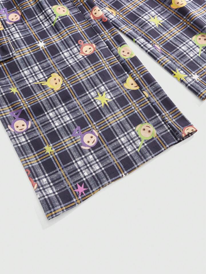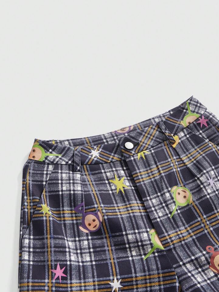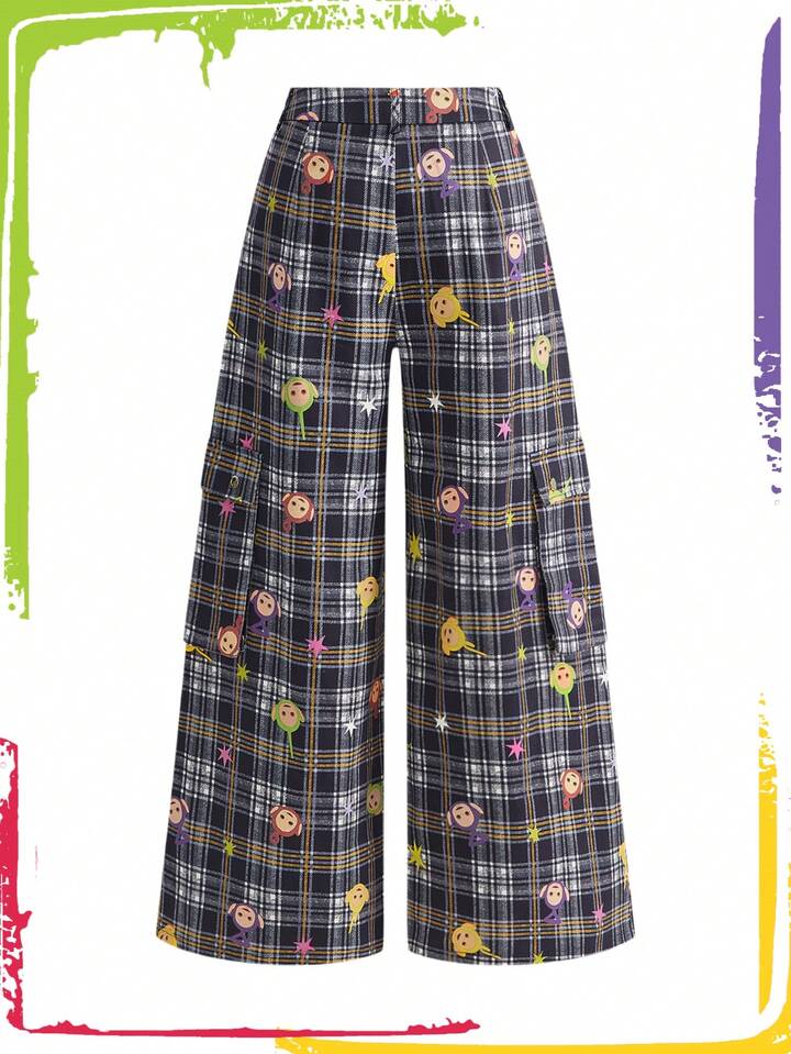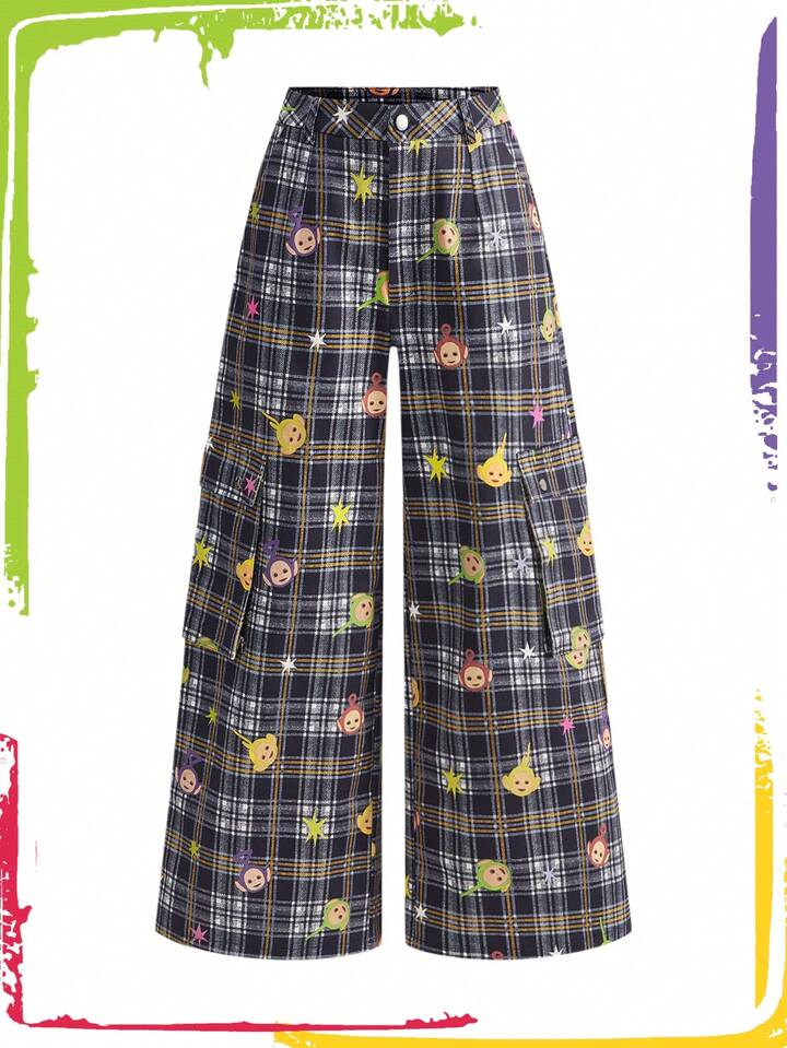 Teletubbies X ROMWE بنطلون نسائي كاجوال بجيوب كارجو وطباعة كاملة على الخطوط المتقاطعة، فضفاض وواسع الساق