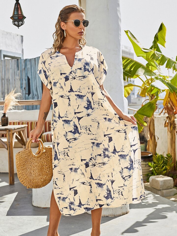 فستان بفتحة فخذ وبقع ألوان