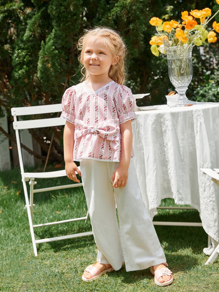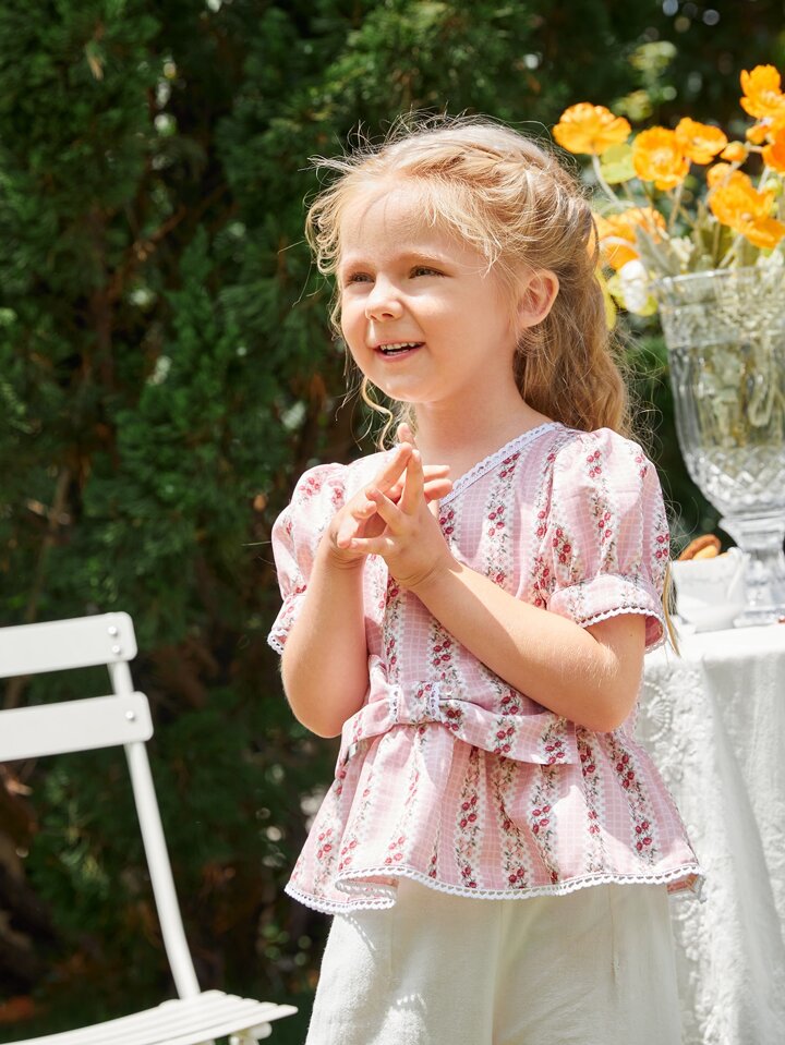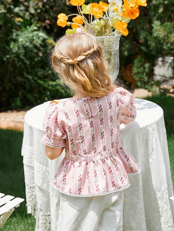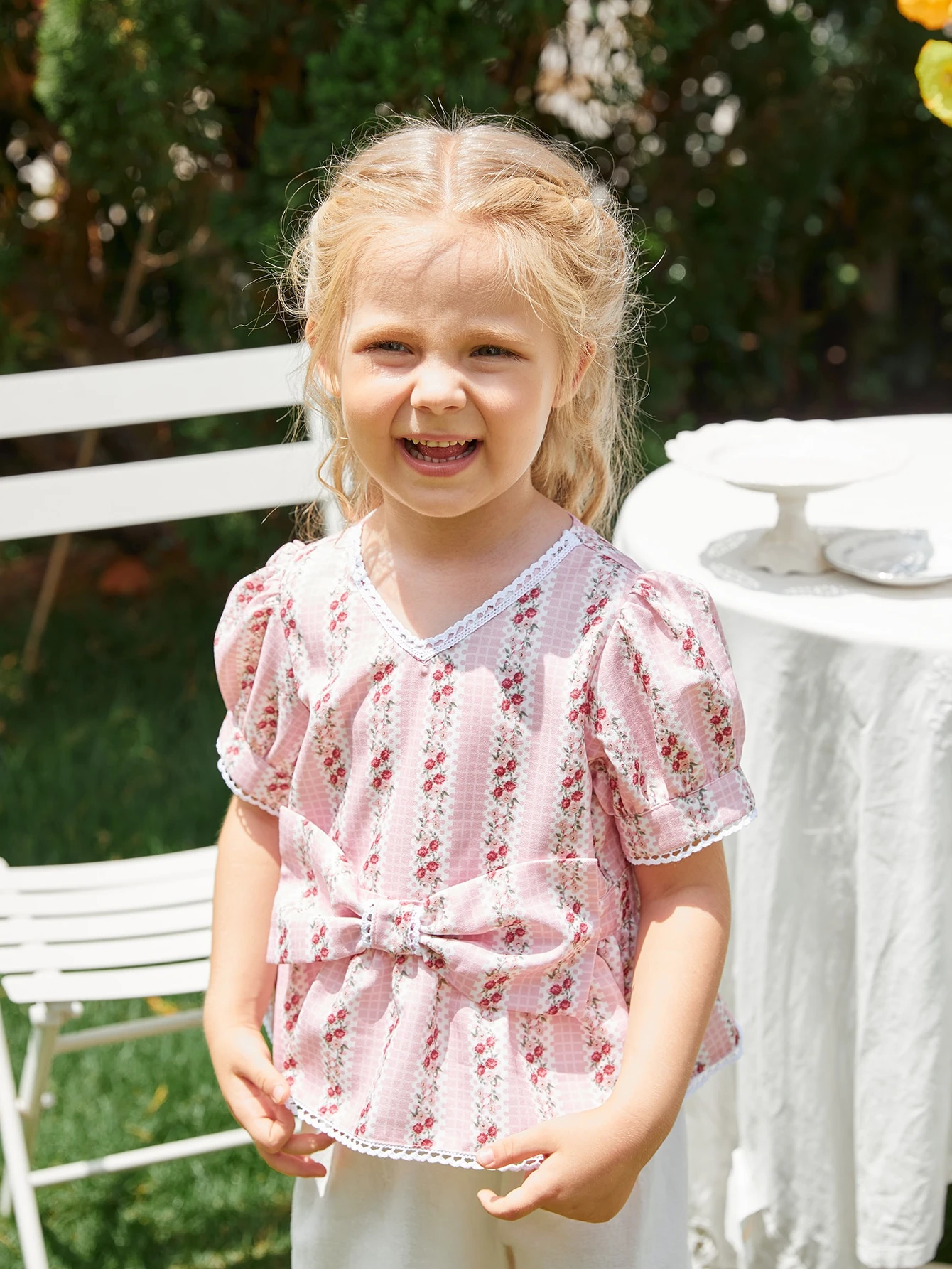لباس علوي مربع النقش مزهر بحزام مقلم بدانتيل 1 قطعة للبنات الصغار