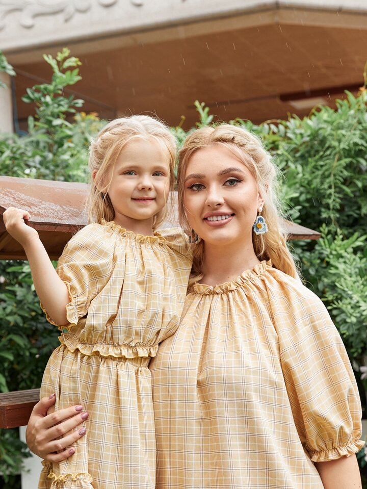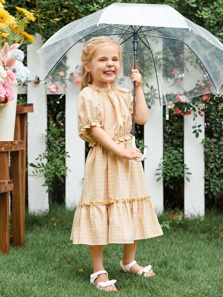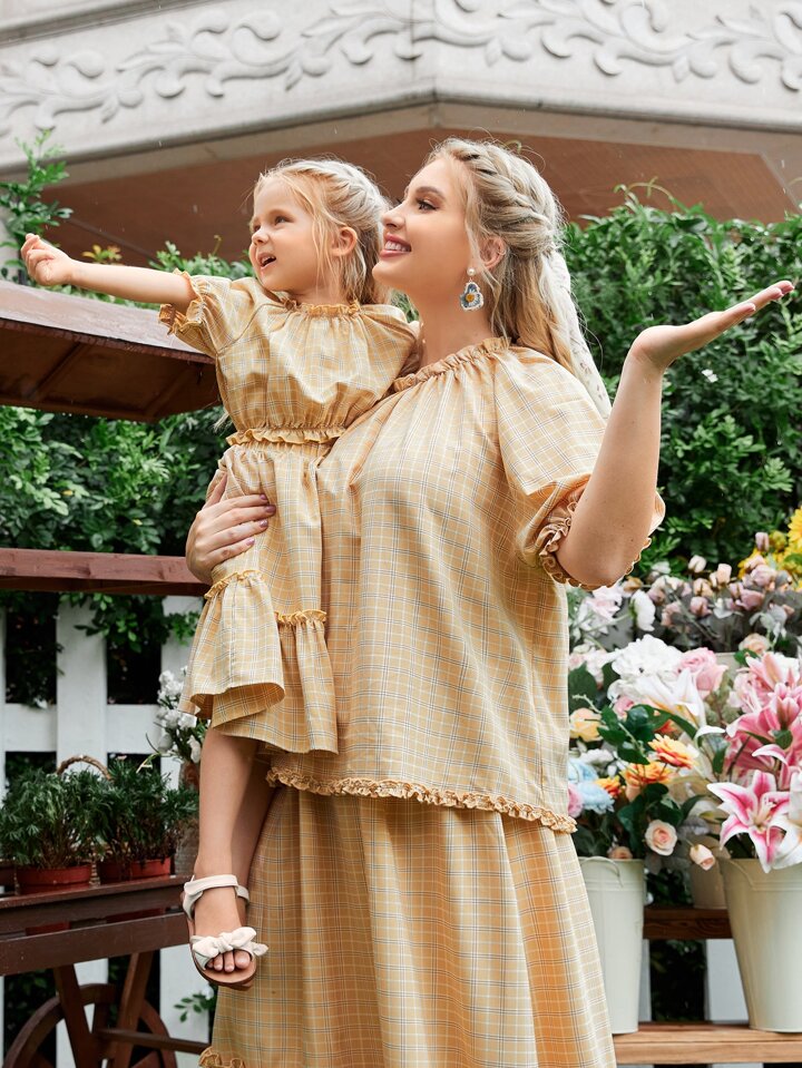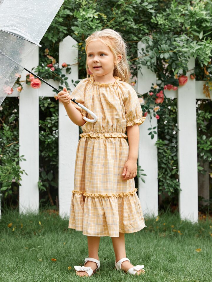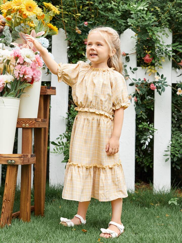 تنورة بحافة مكشكش 1 قطعة مع لباس علوي مربع النقش باكمام بيشوب 1 قطعة للبنات الصغار