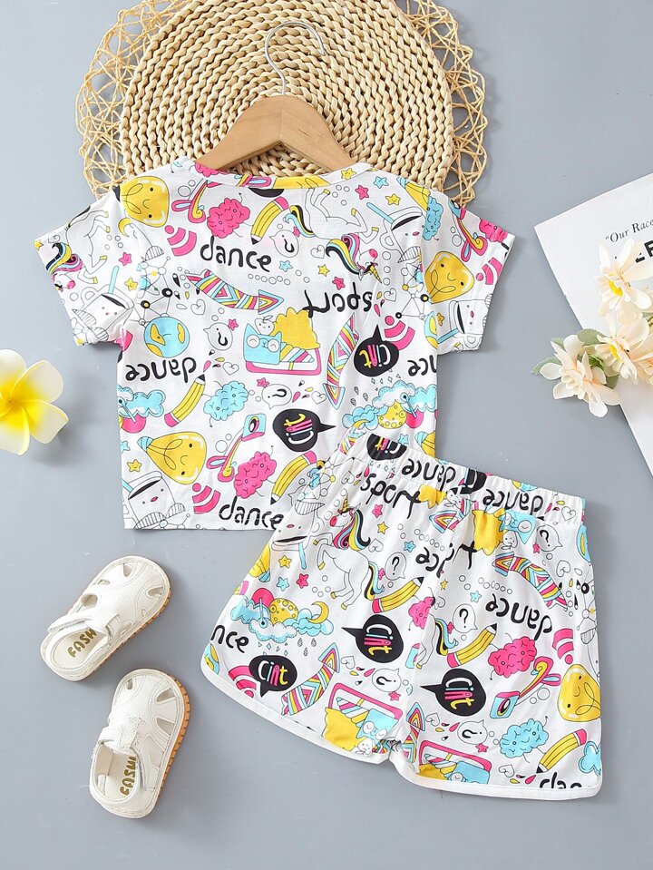 شورت مع تي شيرت بحافة معقود بجرافيك رسوم كارتون للبنات الصغار