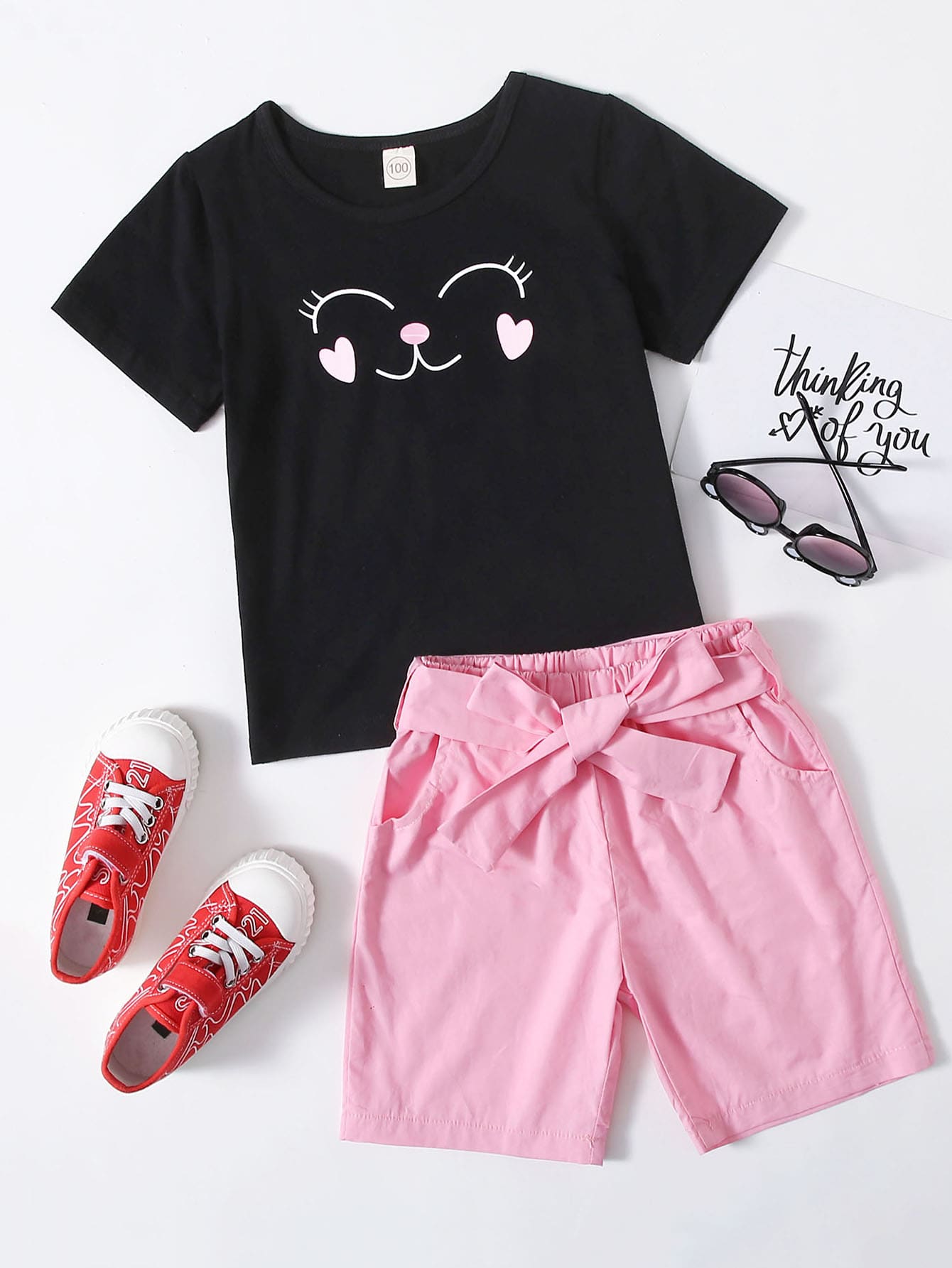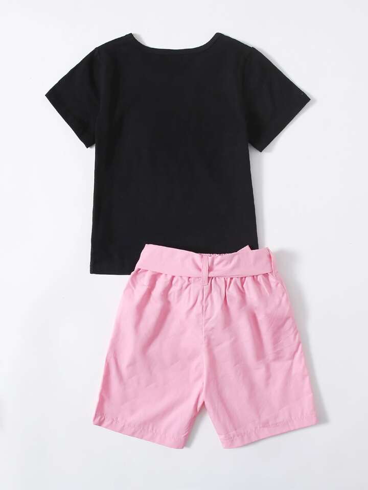 سروال قصير بحزام مع تي شيرت بجرافيك رسوم كارتون للبنات الصغار