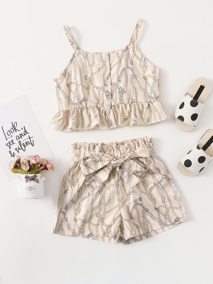 سروال قصير مكشكش ورقي بحزام مع لباس علوي كامي بحافة مكشكشة بطباعة سلسلة للبنات الصغار