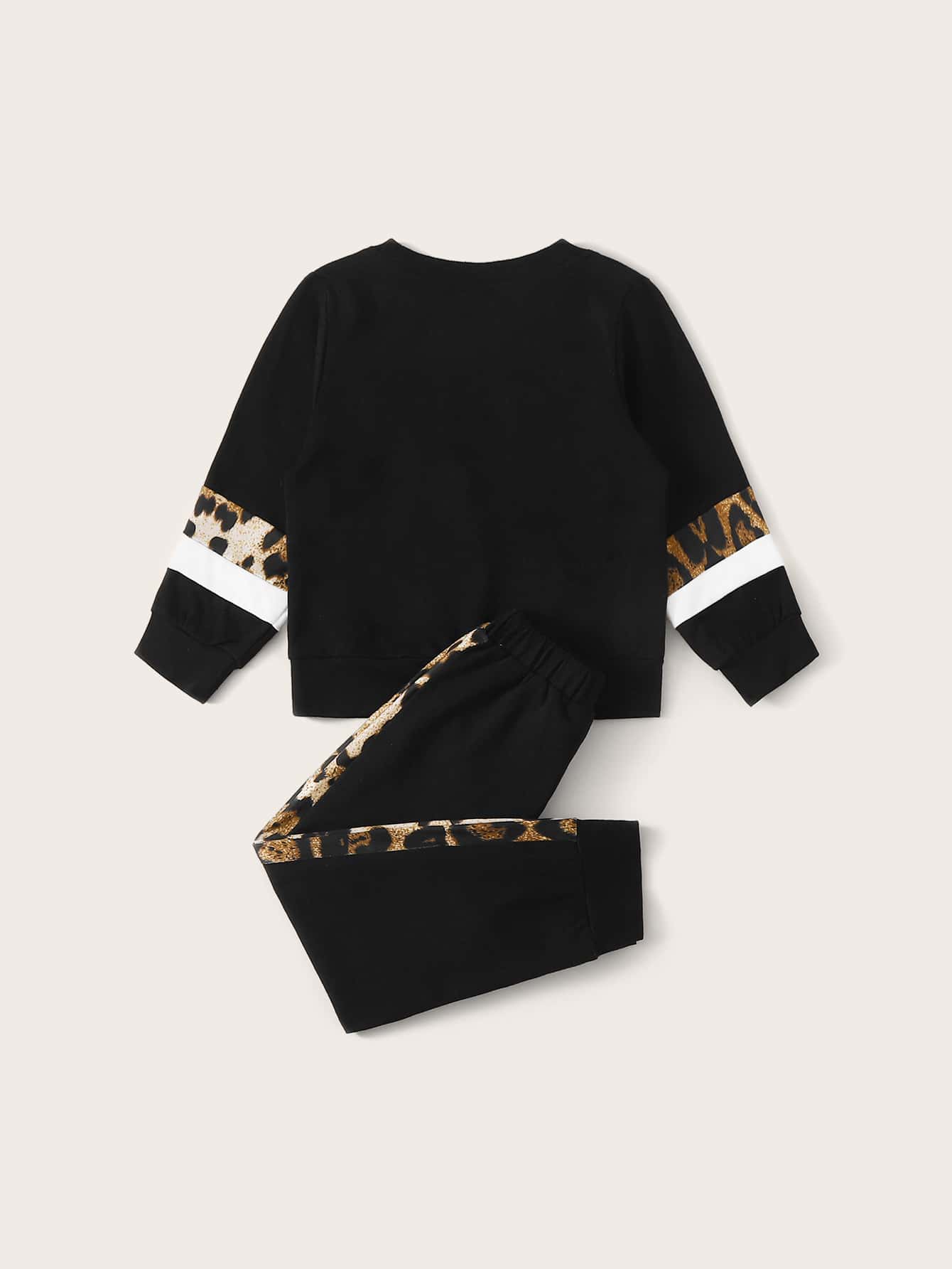 سروال رياضي مع سويت شيرت بلوحة نمط جلد الفهد متباين للبنات الصغار