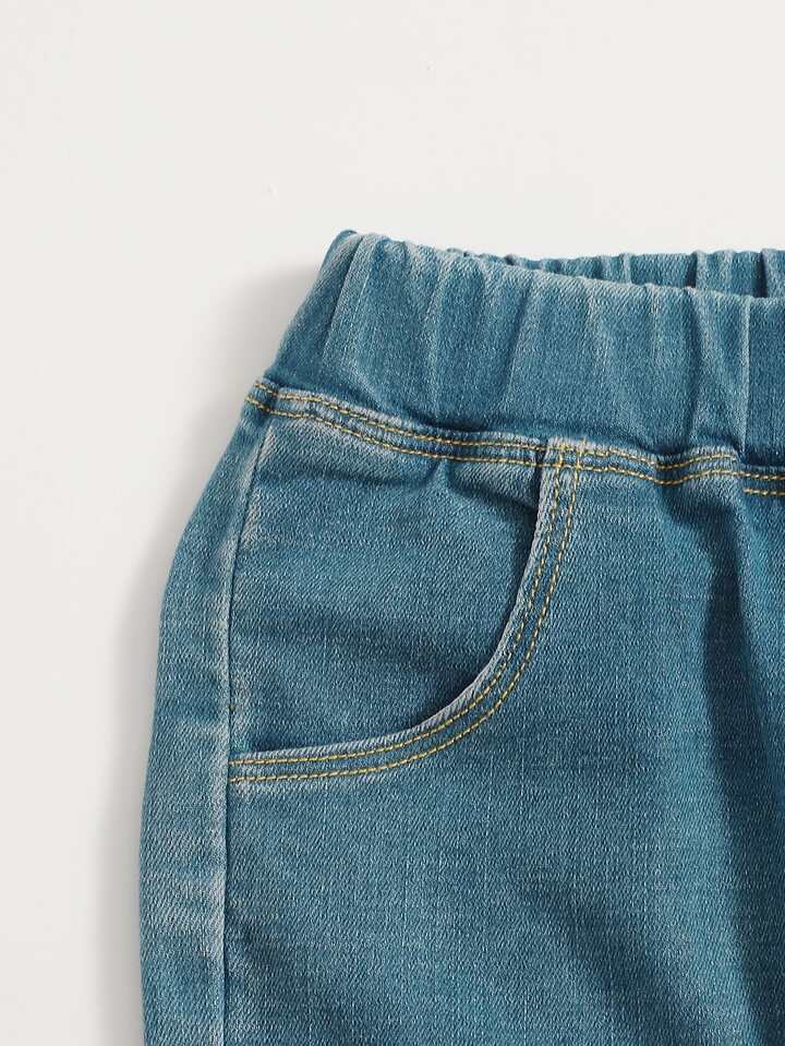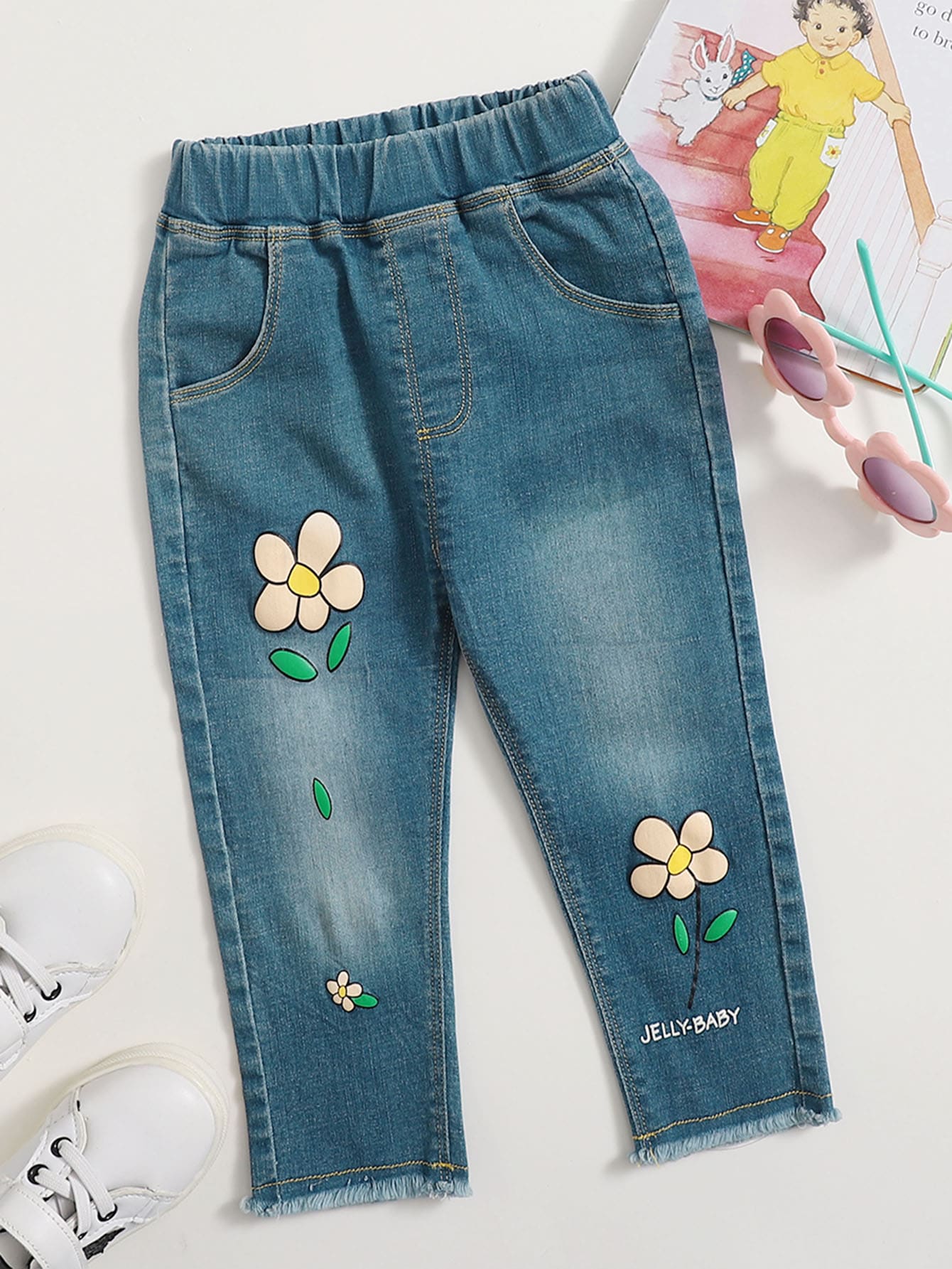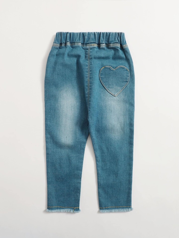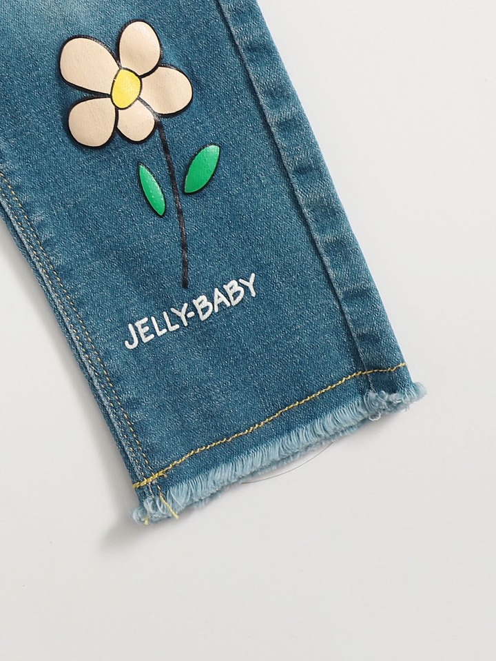 بنطلون جينز بحافة خام وبجرافيك عبارة وزهر للبنات الصغار