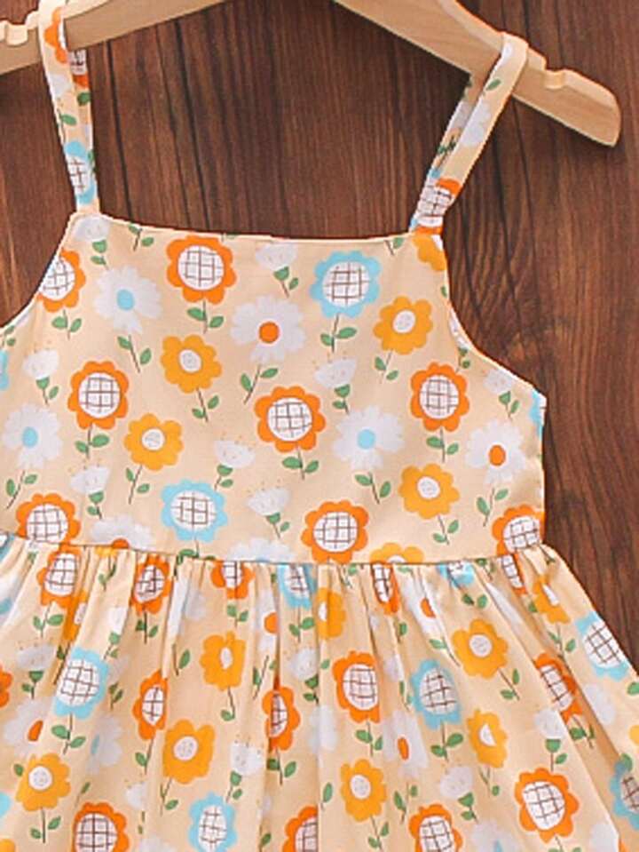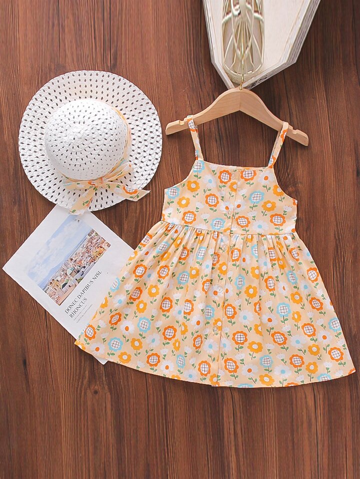 فستان كامي بطباعة زهر مع قبعة للبنات الصغار