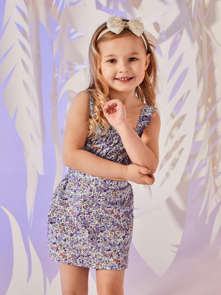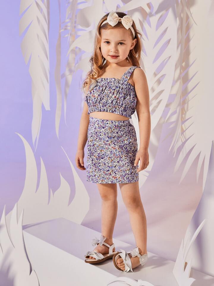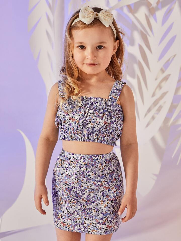 طقم تنورة مع لباس علوي قصير مزهر ومقلم مكشكش للبنات الصغار