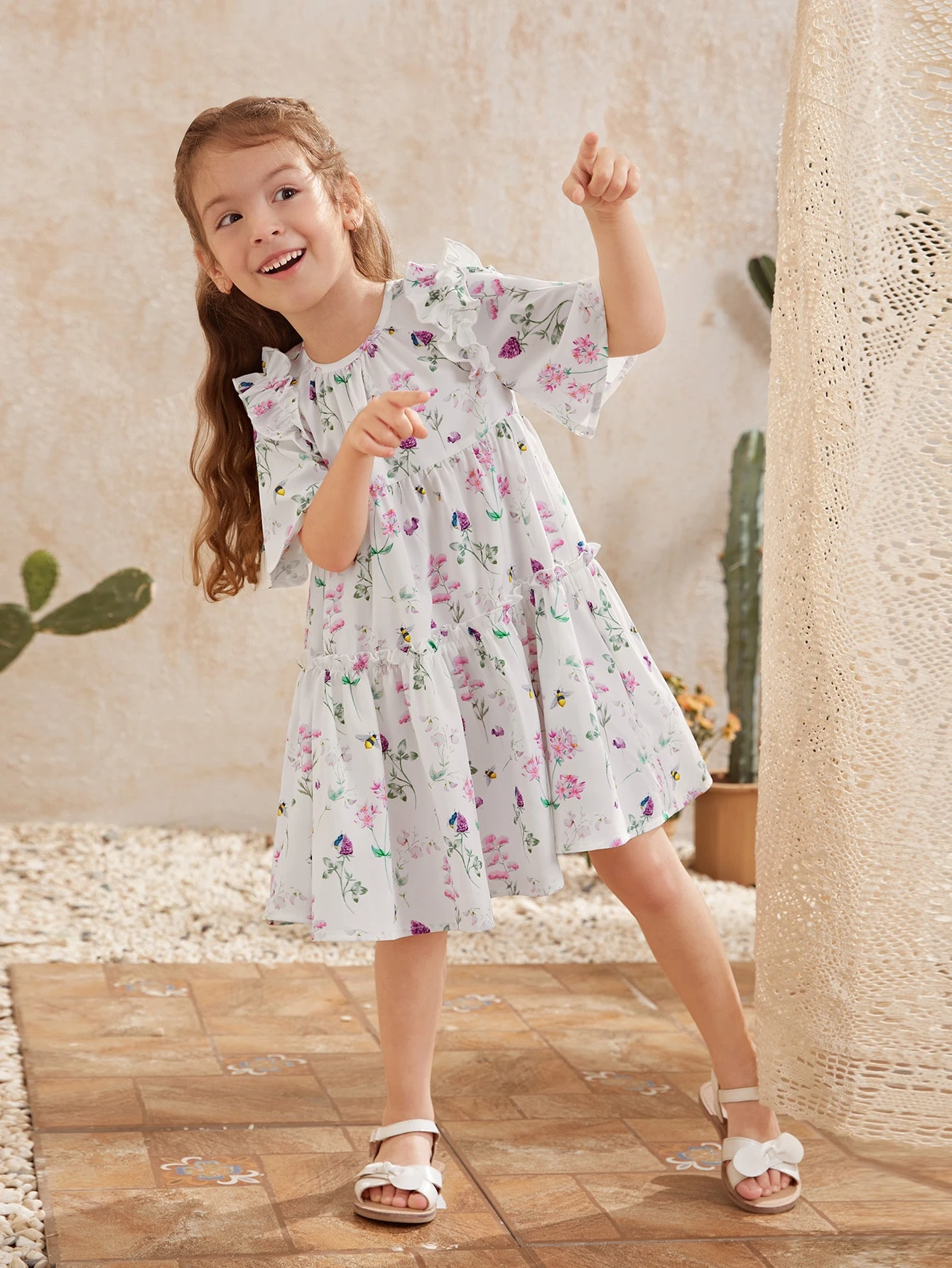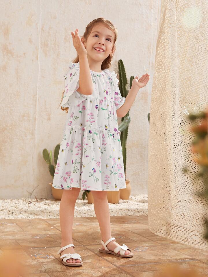 فستان سموك بطباعة زهر مقلم بهدب للبنات الصغار
