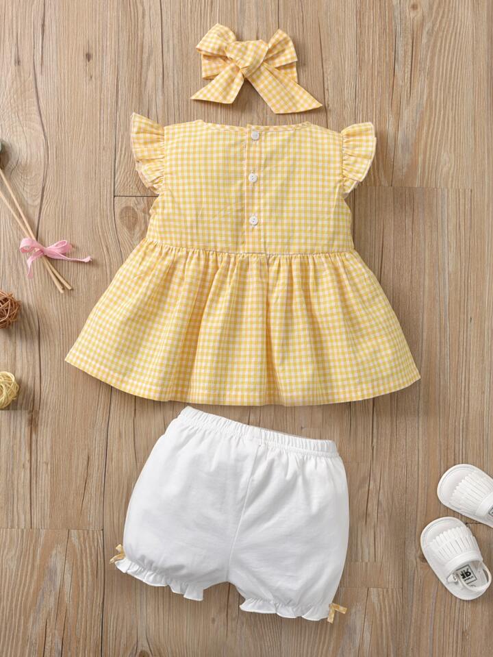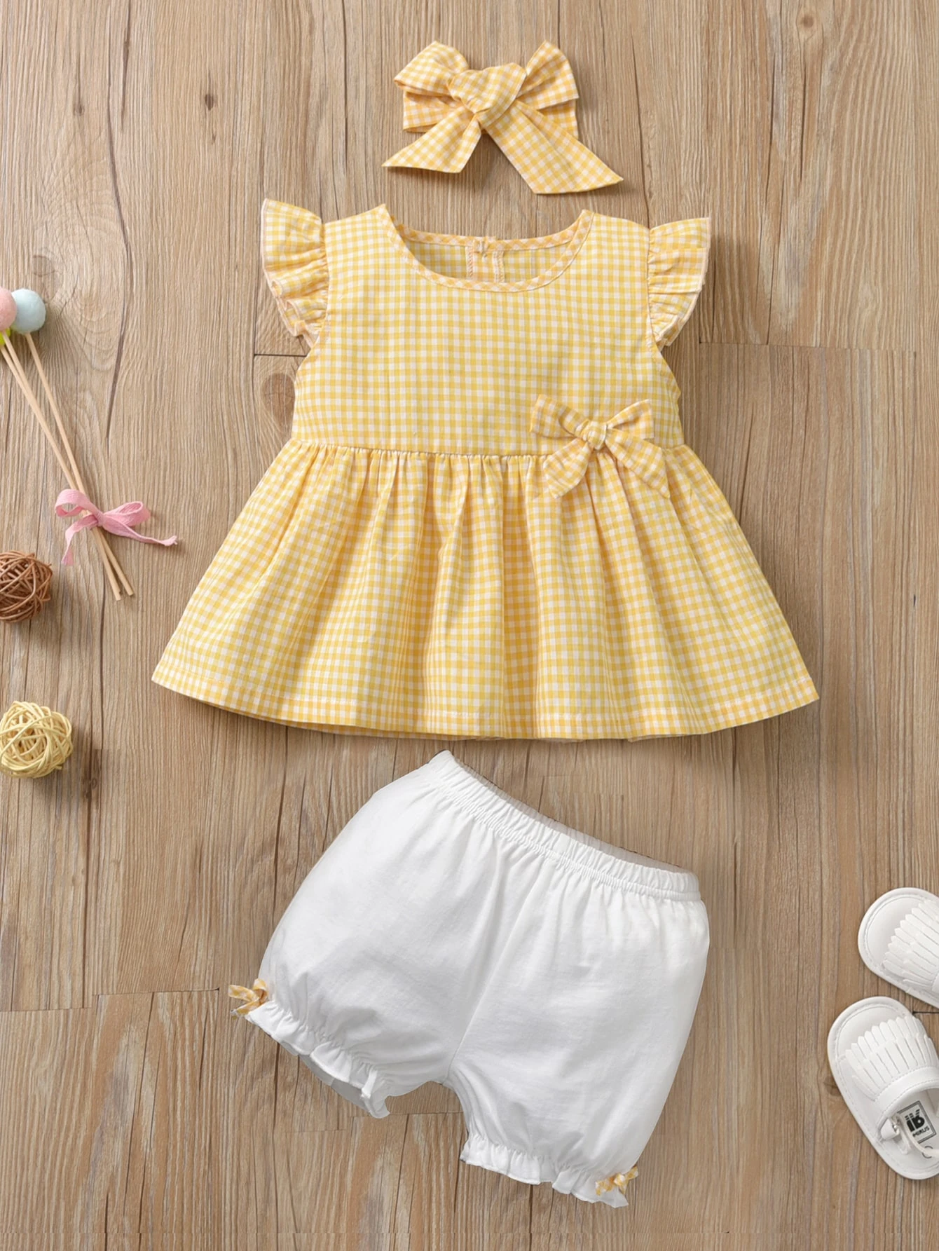 شورت مع لباس علوي مطوي الثنايا قطني مقلم مع عقال راس للبنات الصغار