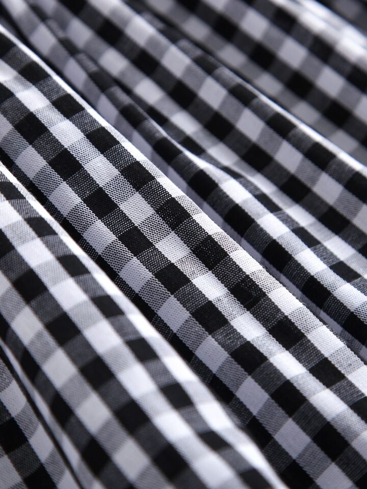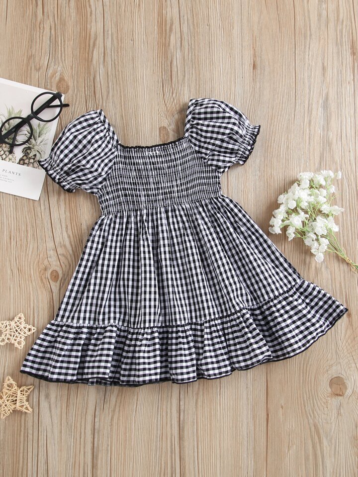 فستان بخط A بعنق مربع مكشكش بطباعة قطني مقلم للبنات الصغار