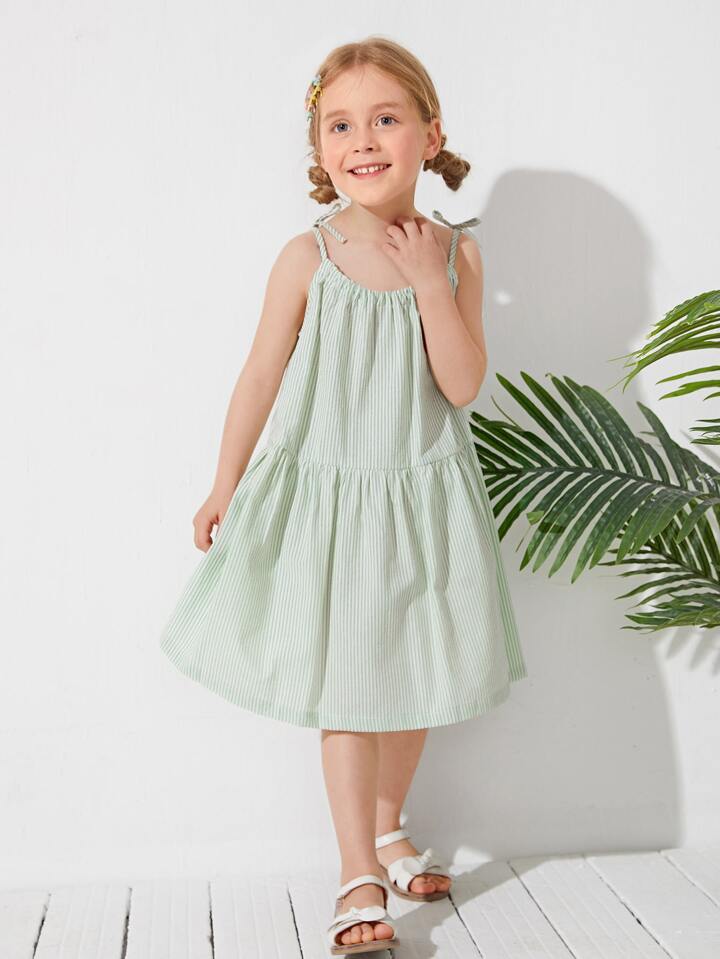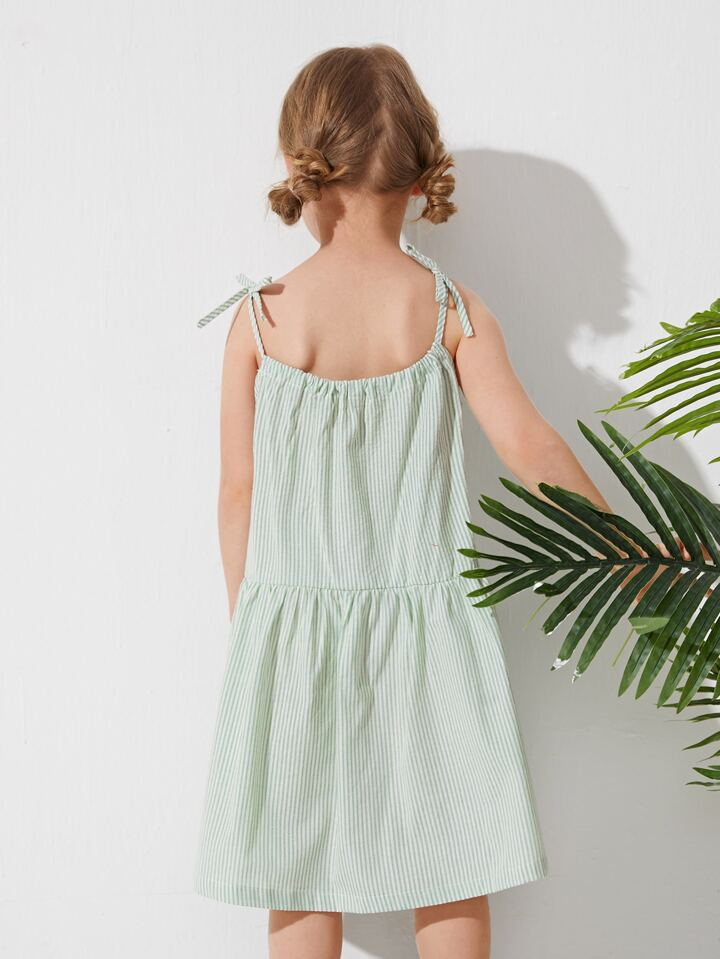 فستان مخطط ومطرز بجزر بحمالات بعقد للبنات الصغار