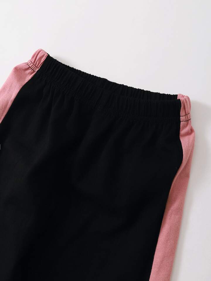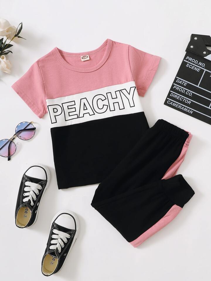 تي شيرت بجرافيك عبارة مع بنطلون بشريط جانبي متباين للبنات الصغار