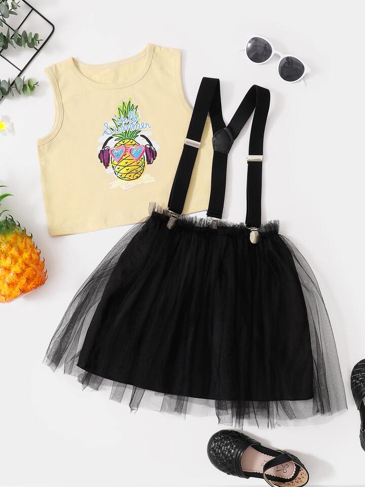 طقم تنورة شامل مع لباس علوي بطباعة اناناس للبنات الصغار