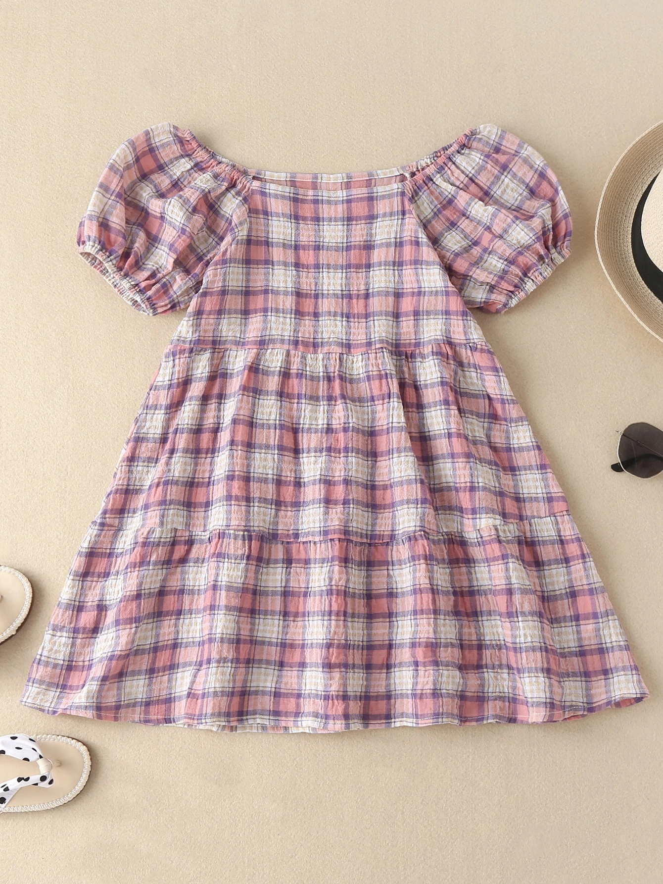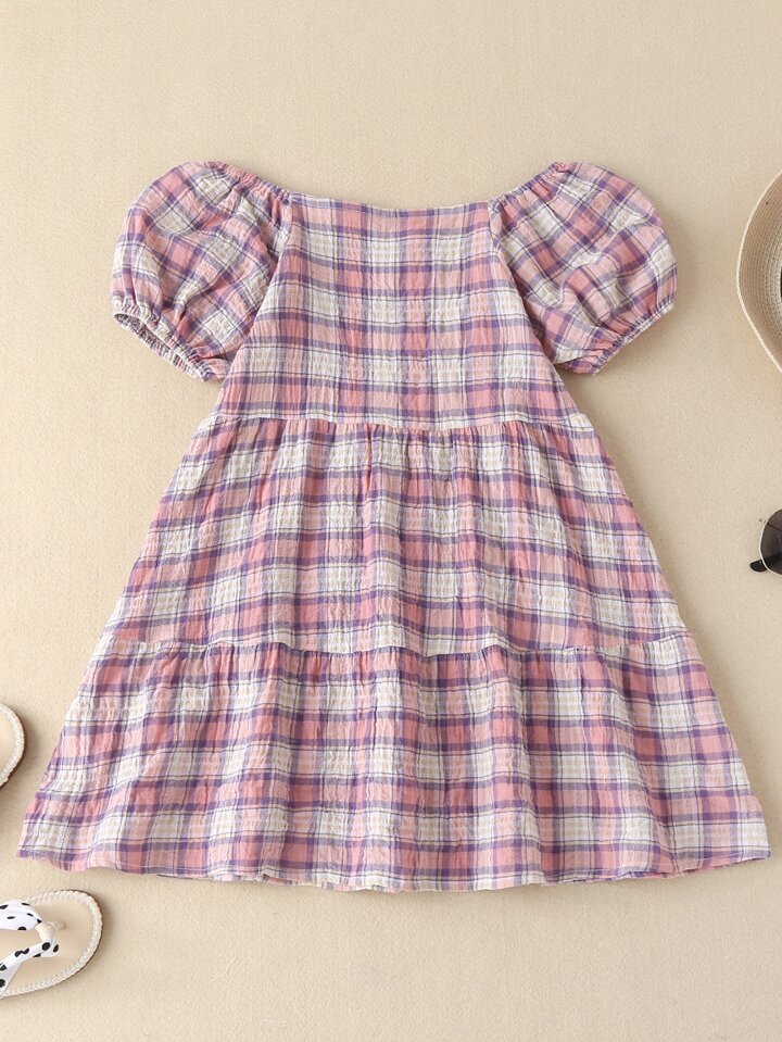 فستان سموك باكمام منفوخ مربع النقش للبنات الصغار