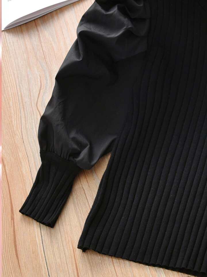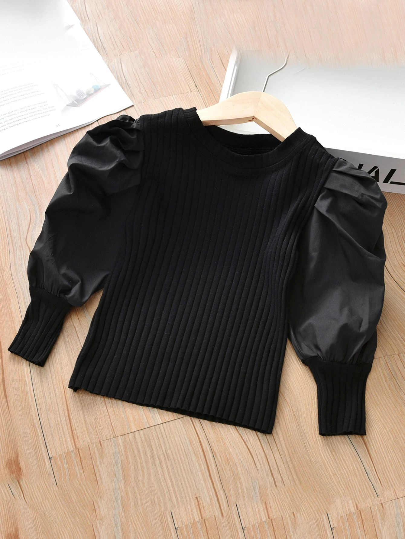 تي شيرت محبوك ومضلع باكمام منتفضة للبنات الصغار