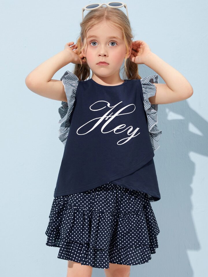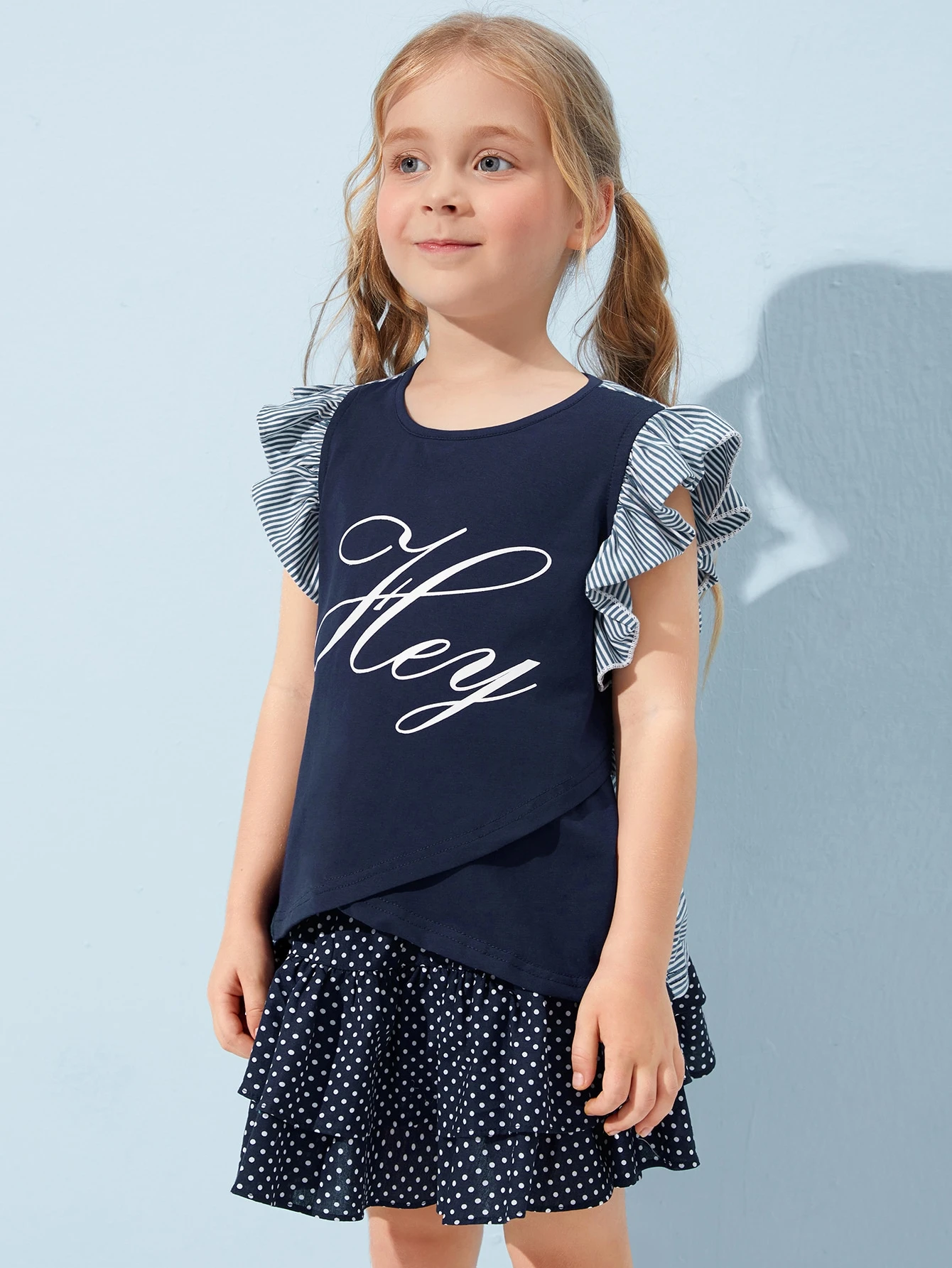 تي شيرت مخطط بجرافيك عبارة وبكتف مكشكش للبنات الصغار