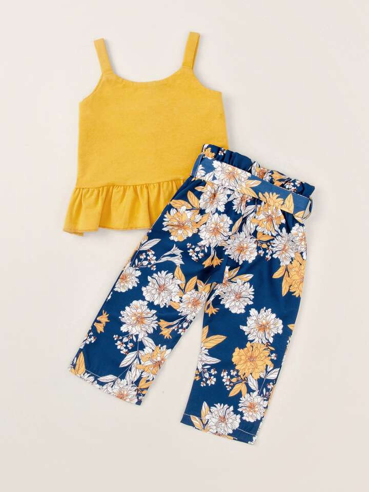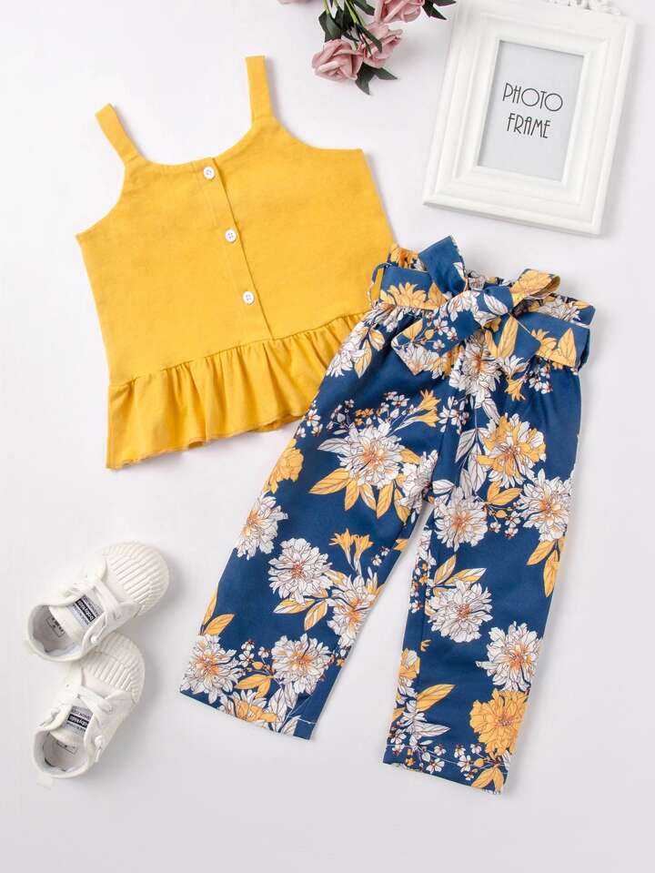 للبنات الصغار حافة مكشكشة صدرية كامي و بطباعة أزهار حزام بنطلون