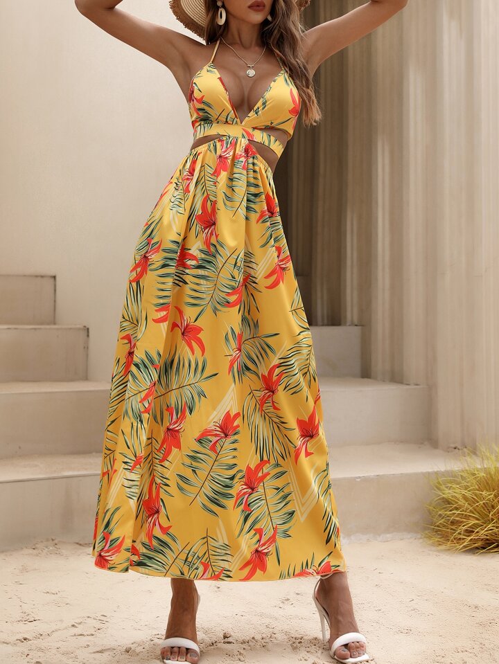 فستان ماكسي طبعات استوائية، بلا ظهر، عنق مستدير مربوط، بشق على مستوي الفخذ للنساء، ملابس شاطئ للعطلة