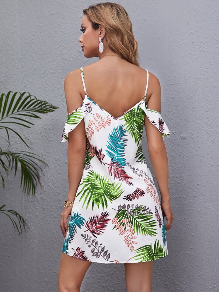 فستان مكشوف الاكتاف وبطباعة استوائي