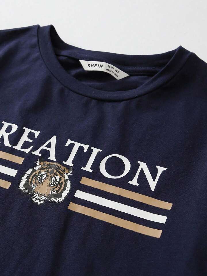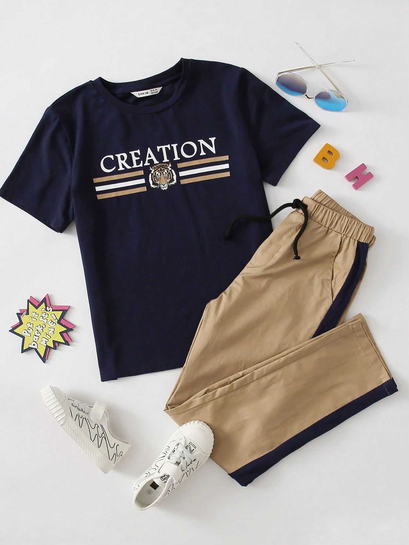 طقم تيشيرت بطباعة حروف ونمر وبنطلون بجيب مائل - أولاد