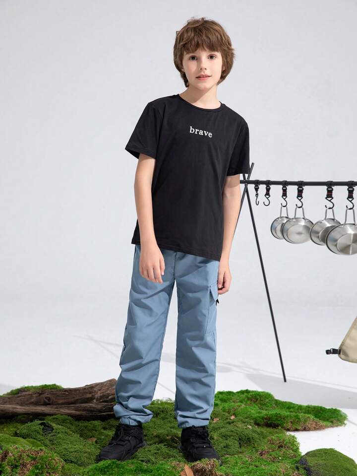 مجموعة تي شيرت صبي برسالة كتابية وبنطال بحزام وجيوب طية