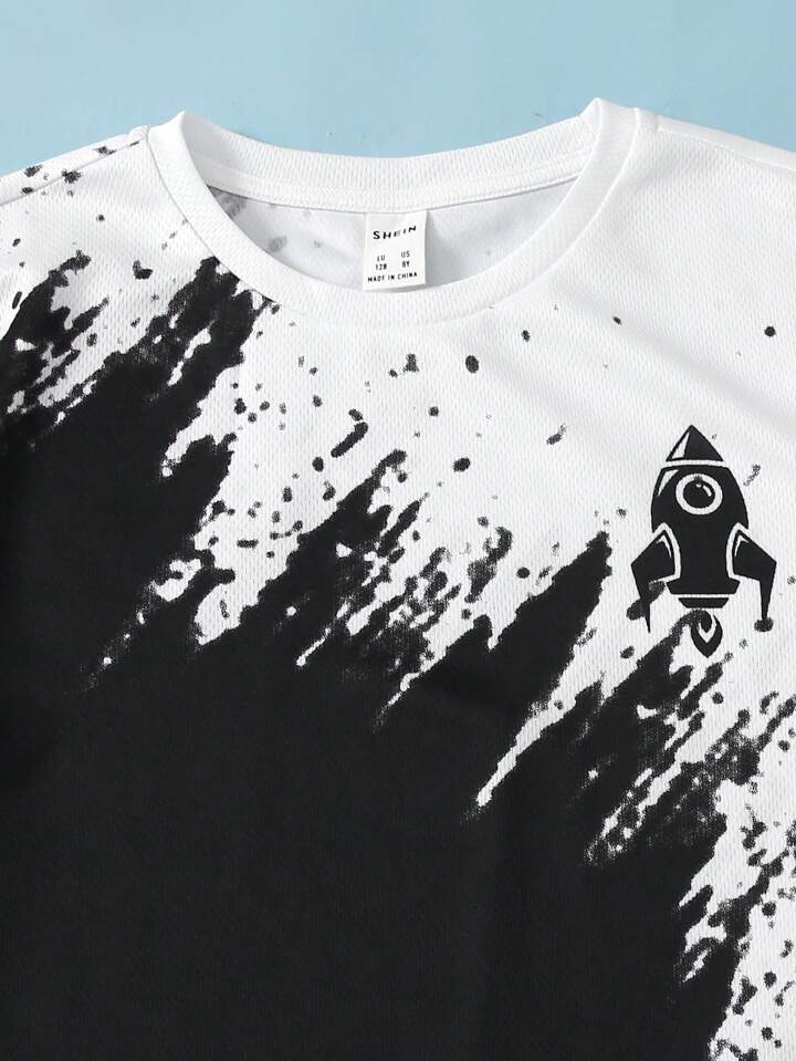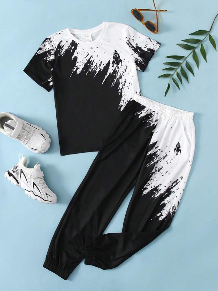 طقم توب بألوان متباينة وطباعة صاروخ وبنطلون اولاد