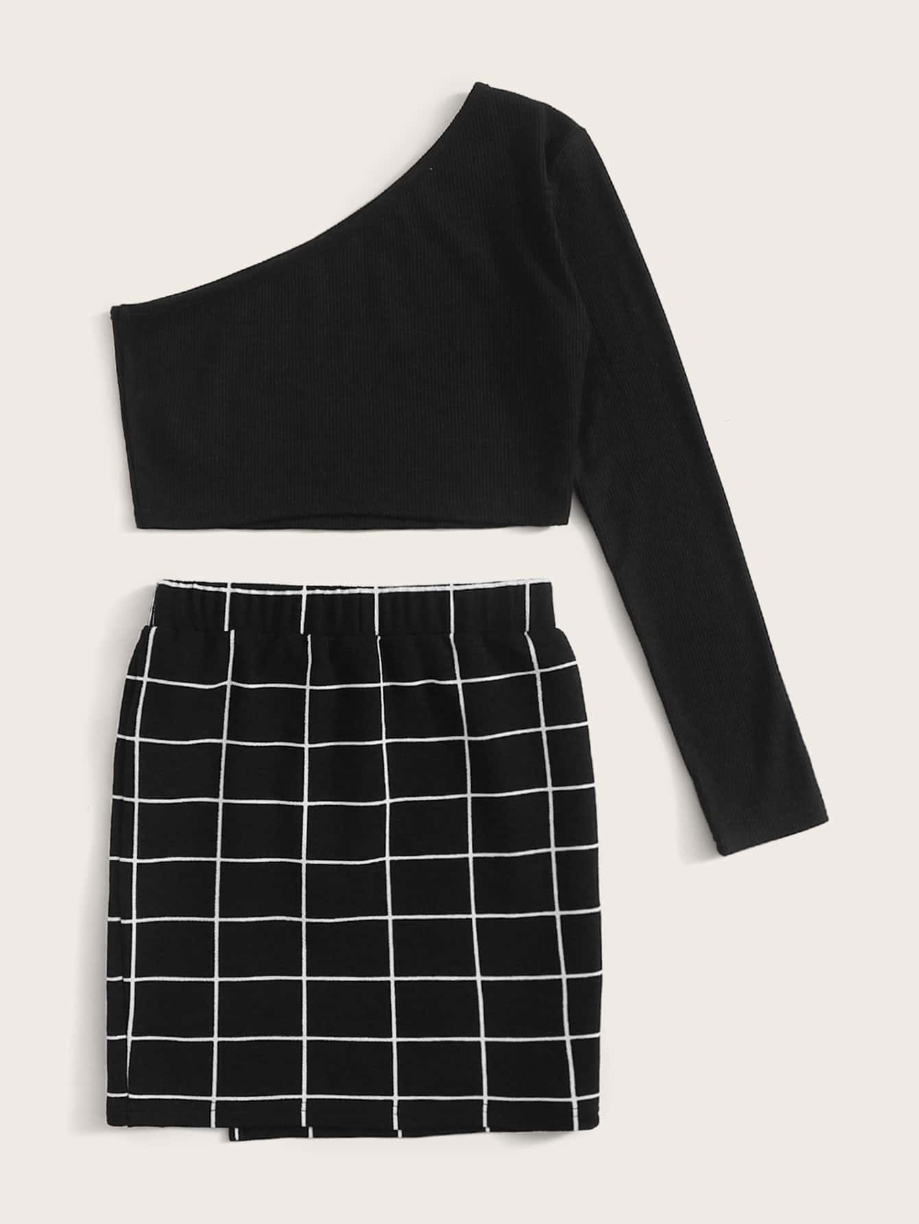 طقم بلوزة وتنورة لفتاة المراهقة بنمط خطوط شبكية وأحد كتفين من الضلع