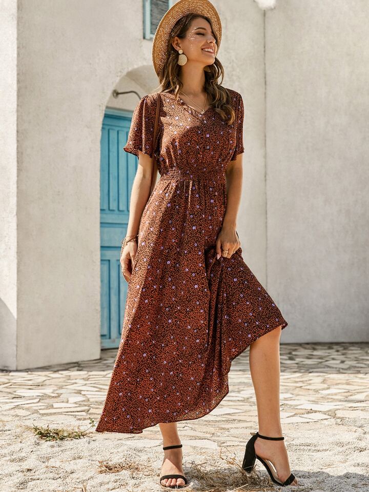 فستان بخط شكل A بطباعة شامل وبعنق شكل V