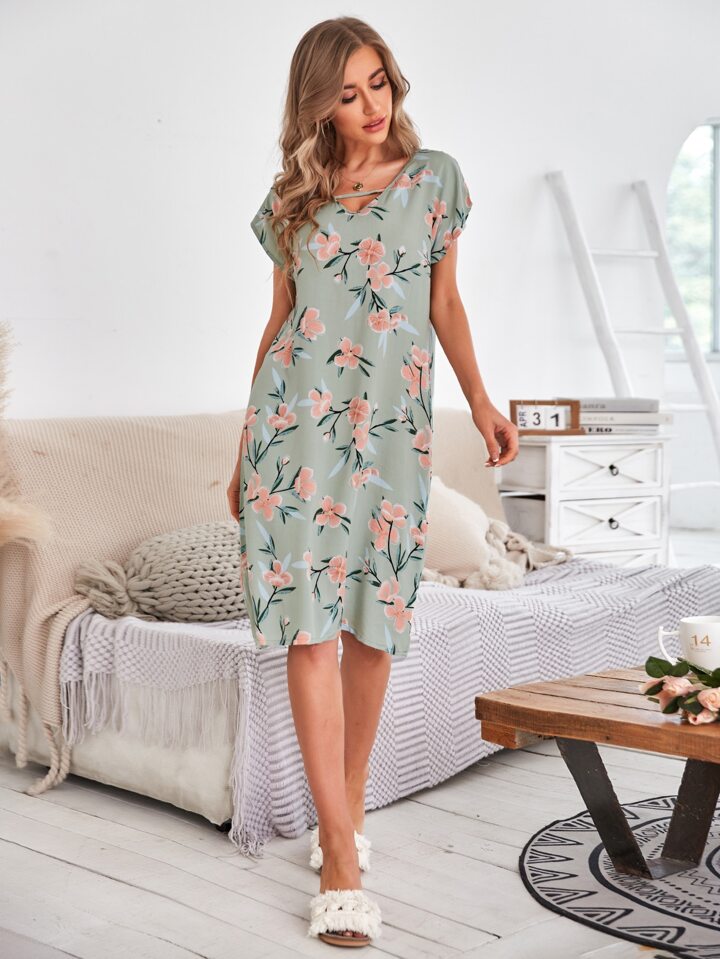 فستان نوم بياقة حرف V واكمام جناح الخفاش وطباعة زهور