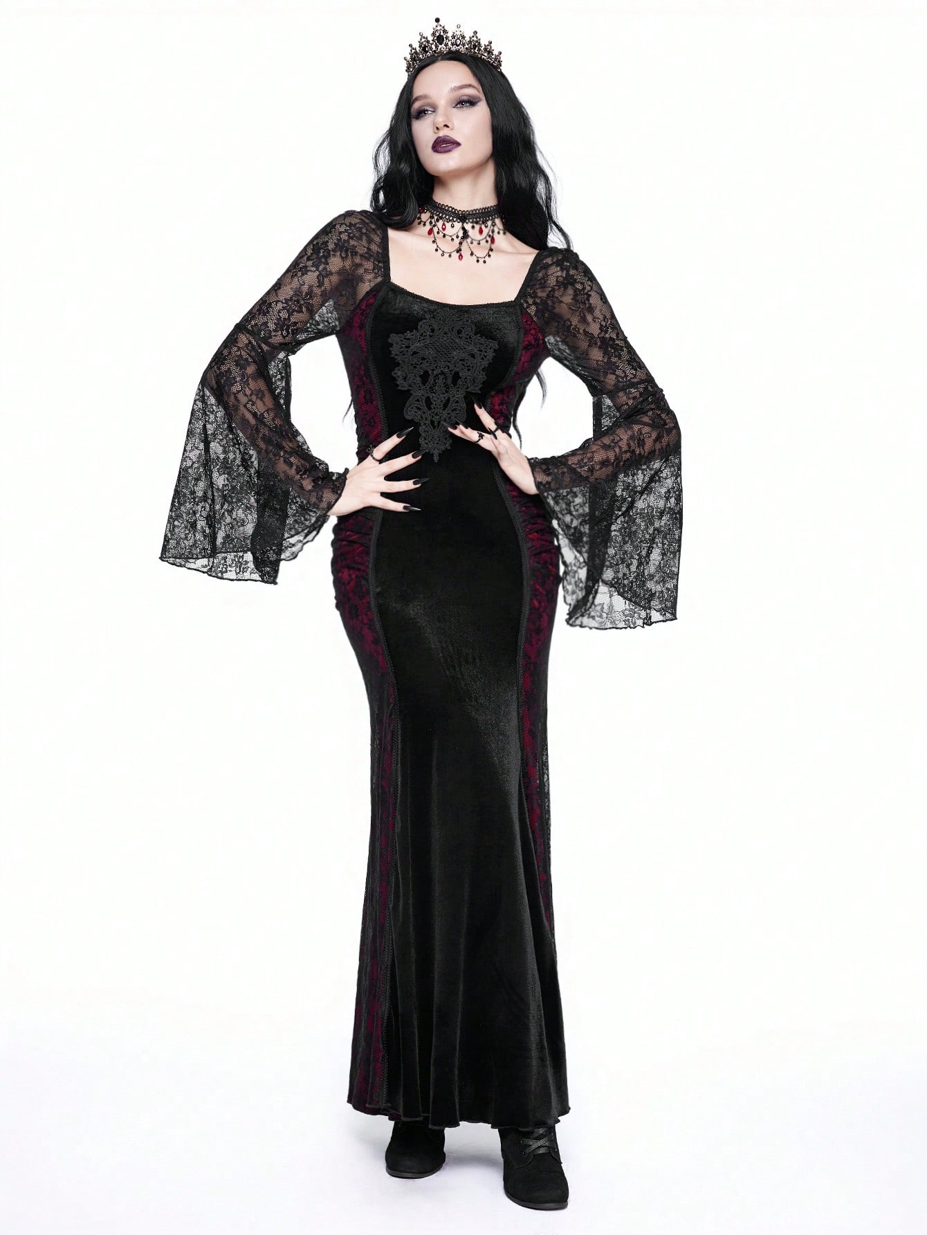 Goth فستان ضيق مع أكمام واسعة على الطراز الجوتي القديم باللون الأسود والأحمر للنساء، مناسب لحفلات رأس السنة الجديدة