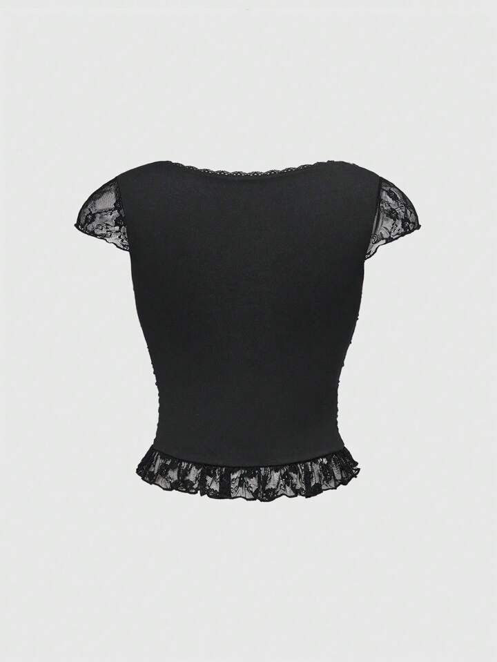Goth قميص ضيق أسود بتفاصيل دانتيل بأسلوب رومانسي كلاسيكي للنساء