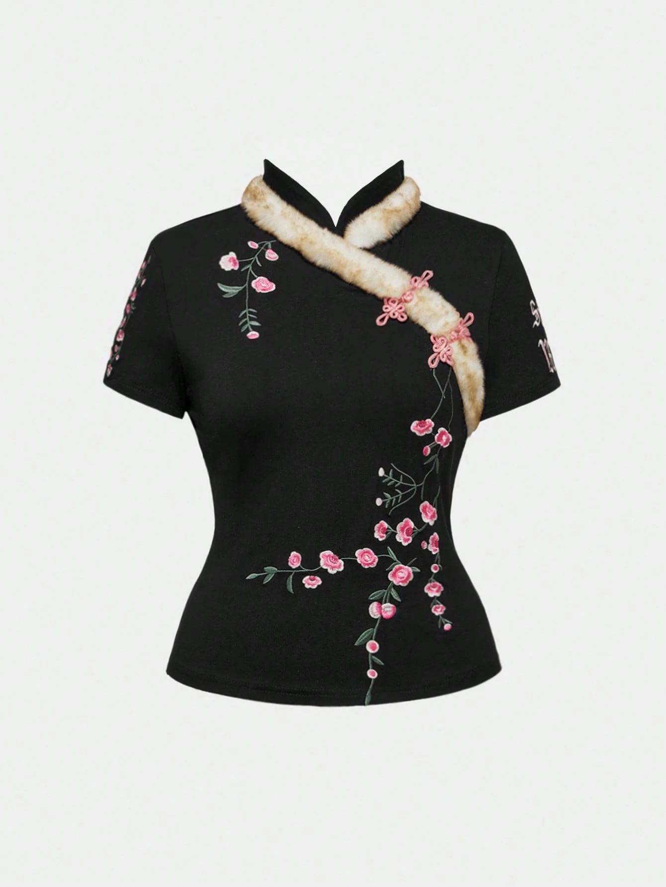 قميص نسائي بياقة ماندرين ذو قصة ضيقة، مطرز بزخارف نباتية وتفاصيل من الفرو، بطراز صيني عتيق جديد