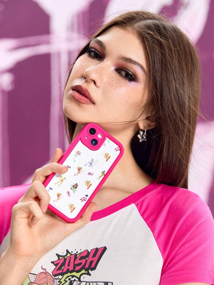 Winx Club X ROMWE 1 قطعة غطاء هاتف وردي فاتح به طباعة شخصية كارتونية ممكن استخدامه مع جميع موديلات آيفون والهواتف الأخرى