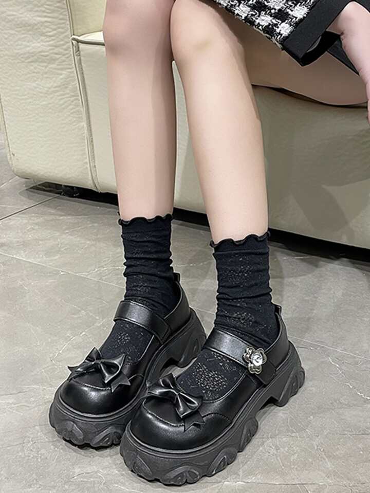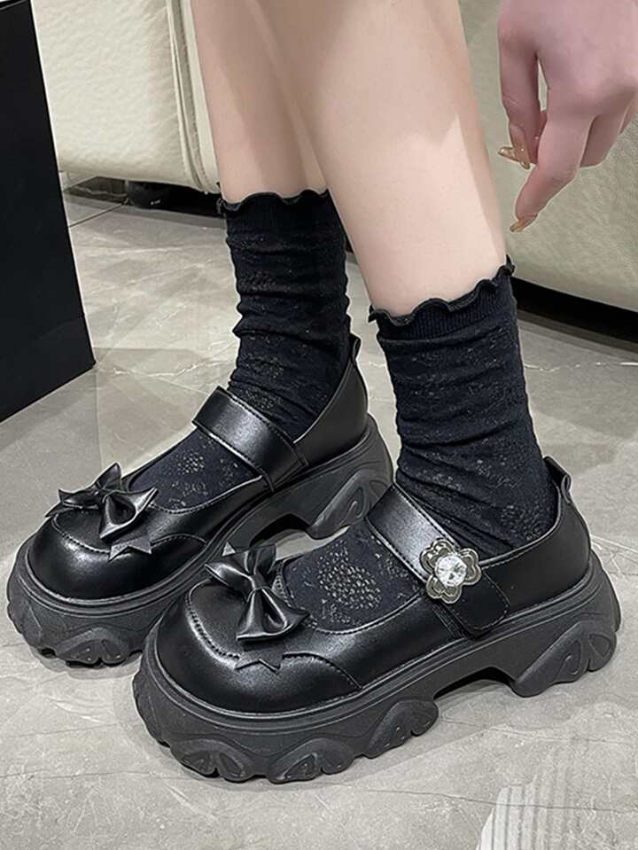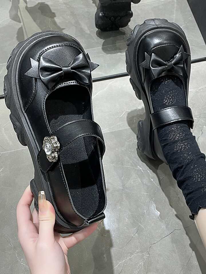 حذاء نسائي دائري مزين بفيونكة وحذاء ماري جين أسود